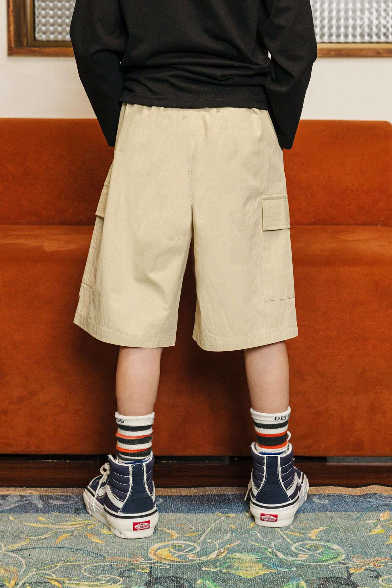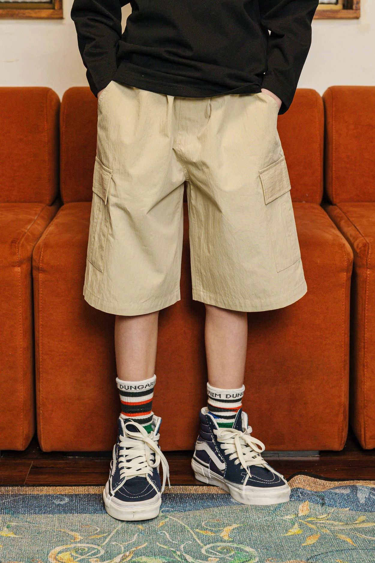 • 品名:鬆緊腰側口袋工裝過膝褲