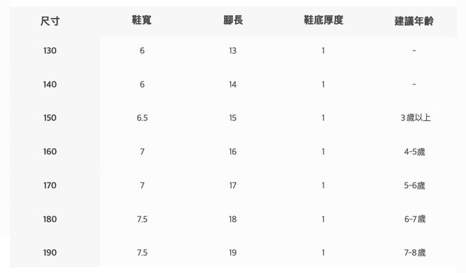 2. 每個尺寸的建議年齡、建議身高僅供參考,每位孩子發育狀況各有不同,建議參考寶貝現有的衣物/鞋子尺寸做對照。