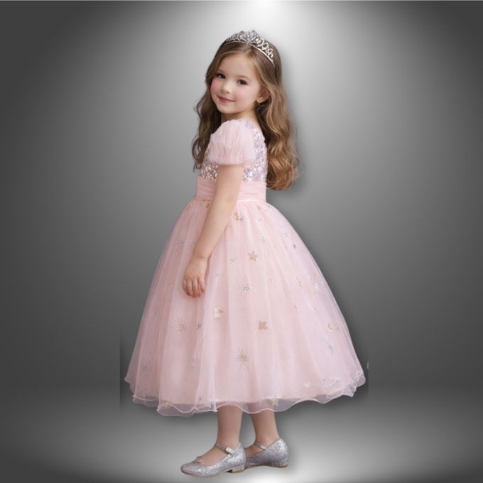 柔美粉繡花亮片釘珠裝飾短袖長裙禮服-淺粉色