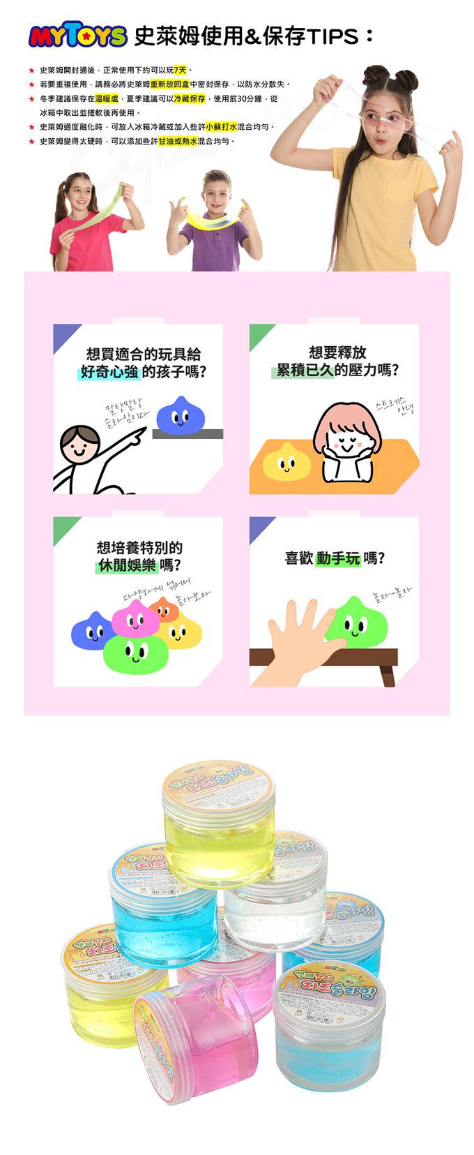 注意事項:●請勿使用於玩具外用途 ●使用後請將雙手清洗乾淨 ●請避免長時間觸摸本產品以避免造成皮膚損傷,如有過敏反應者,請立即暫停使用 ●請避開火源、日光直射及高溫處保存 ●孩童請在監護人陪同下使用 ●若不慎沾到頭髮或衣物,可使用溫水沖洗 ●請勿食用本產品,若不慎吞入,請立即催吐後盡速就醫