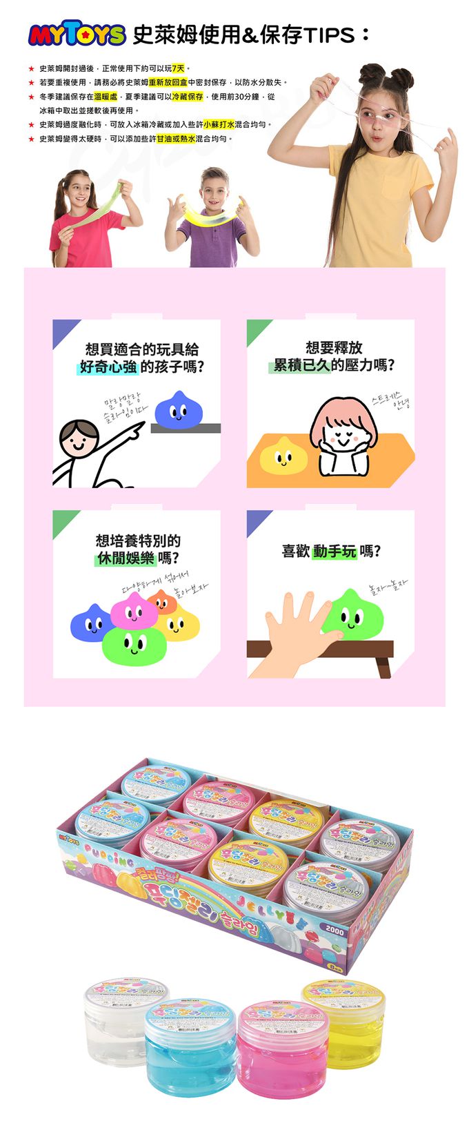 注意事項:●請勿使用於玩具外用途 ●使用後請將雙手清洗乾淨 ●請避免長時間觸摸本產品以避免造成皮膚損傷,如有過敏反應者,請立即暫停使用 ●請避開火源、日光直射及高溫處保存 ●孩童請在監護人陪同下使用 ●若不慎沾到頭髮或衣物,可使用溫水沖洗 ●請勿食用本產品,若不慎吞入,請立即催吐後盡速就醫