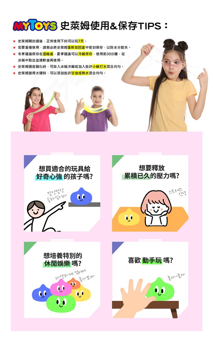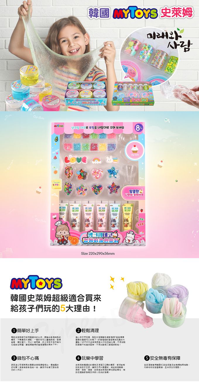 注意事項:●請勿使用於玩具外用途 ●使用後請將雙手清洗乾淨 ●請避免長時間觸摸本產品以避免造成皮膚損傷,如有過敏反應者,請立即暫停使用 ●請避開火源、日光直射及高溫處保存 ●孩童請在監護人陪同下使用 ●若不慎沾到頭髮或衣物,可使用溫水沖洗 ●請勿將本產品混合刮鬍泡或清潔劑等其他物質使用 ●請勿食用本產品,若不慎吞入,請立即催吐後盡速就醫 ●請勿將史萊姆與奶油膠混合使用 ●產品外盒印刷的材料形狀及顏色可能與實體有差異 ●本產品包含可能導致窒息的小珠子,請注意避免嬰幼兒吞食