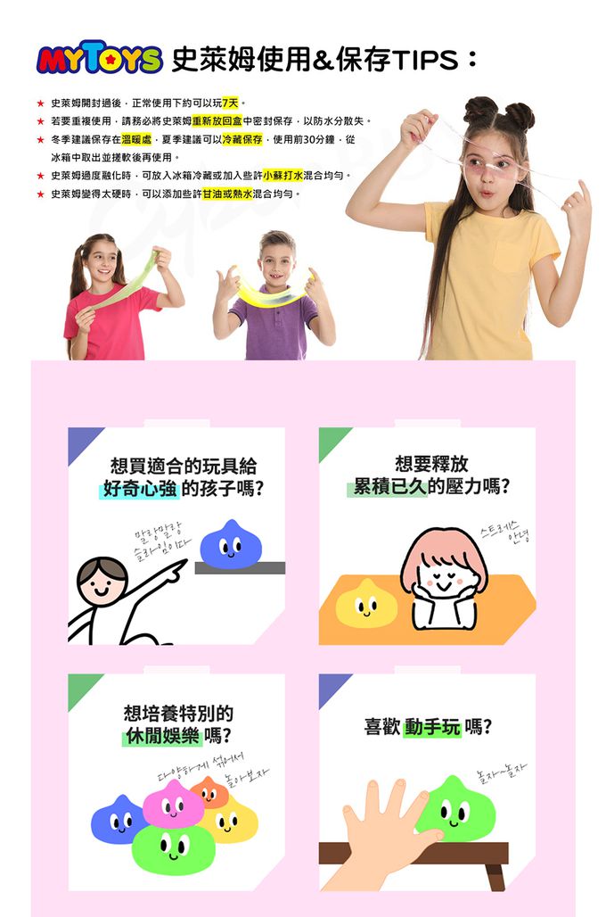 注意事項:●請勿使用於玩具外用途 ●使用後請將雙手清洗乾淨 ●請避免長時間觸摸本產品以避免造成皮膚損傷,如有過敏反應者,請立即暫停使用 ●請避開火源、日光直射及高溫處保存 ●孩童請在監護人陪同下使用 ●若不慎沾到頭髮或衣物,可使用溫水沖洗 ●請勿將本產品混合刮鬍泡或清潔劑等其他物質使用 ●請勿食用本產品,若不慎吞入,請立即催吐後盡速就醫 ●請勿將史萊姆與奶油膠混合使用 ●產品外盒印刷的材料形狀及顏色可能與實體有差異 ●本產品包含可能導致窒息的小珠子,請注意避免嬰幼兒吞食