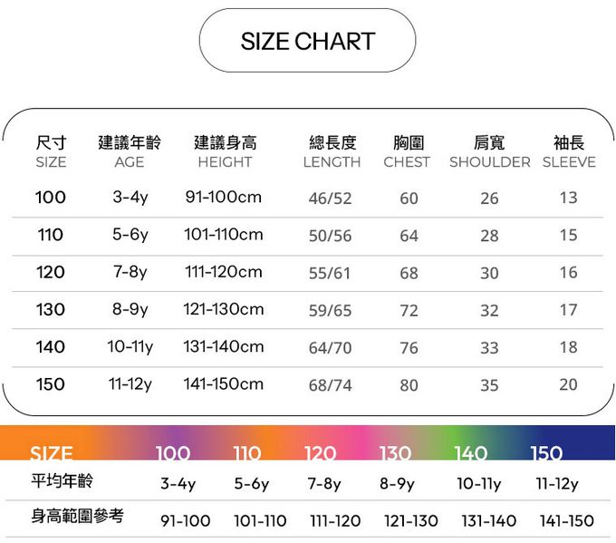 尺寸齊全,91-150公分的尺寸都有,大小孩和小寶貝都可以穿!