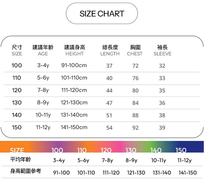 1. 尺寸表單位皆為公分(cm),實際尺寸會因布料彈性、水洗、測量起迄點等因素略有誤差。建議參考孩子平時穿著衣物尺寸進行選購。