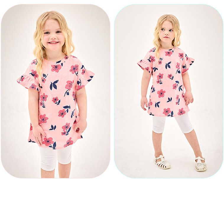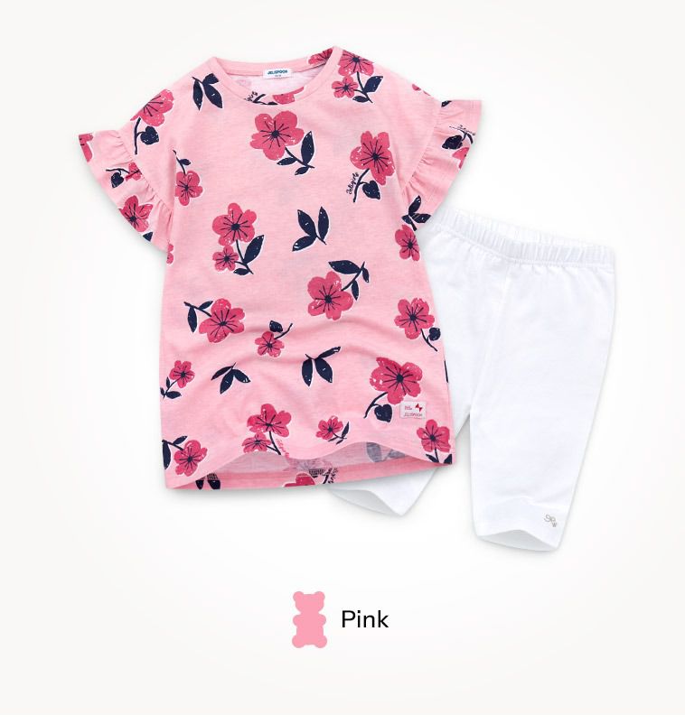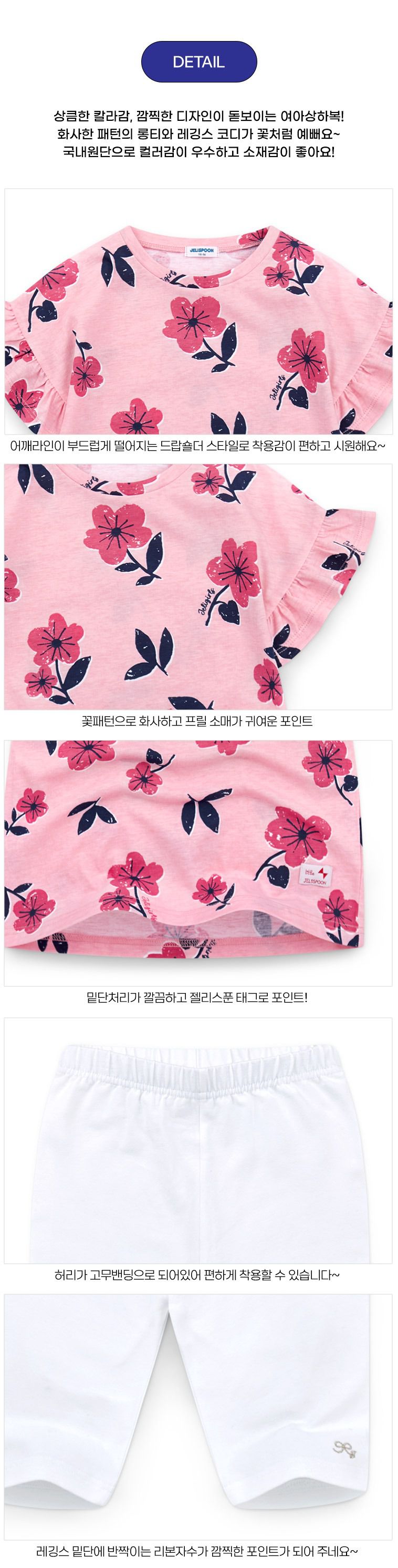 韓國 Jelispoon - 大花印荷葉袖上衣X內搭褲套裝-粉X白