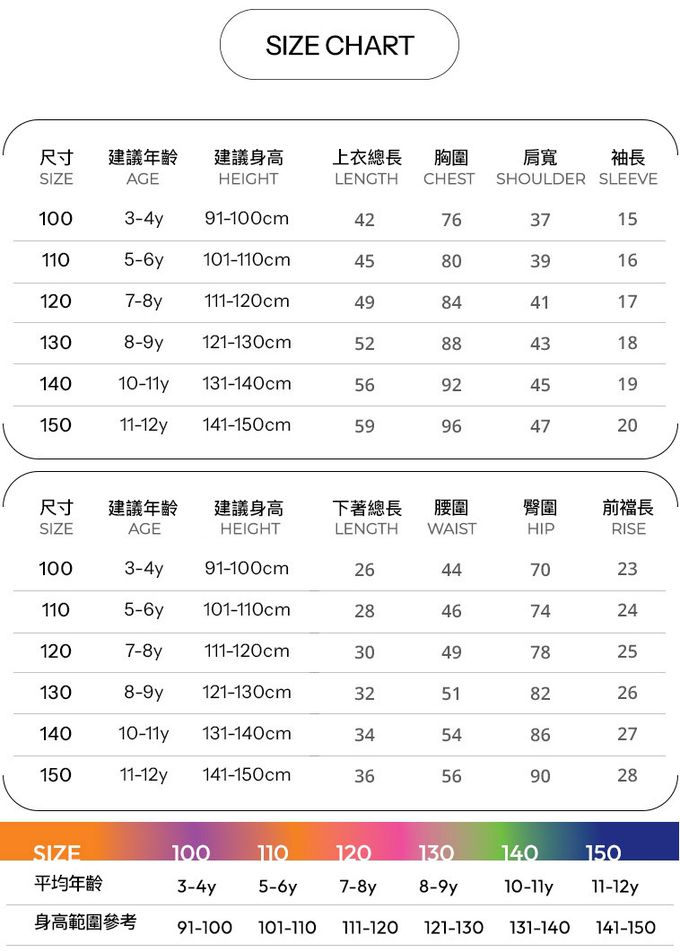 1. 尺寸表單位皆為公分(cm),實際尺寸會因布料彈性、水洗、測量起迄點等因素略有誤差。建議參考孩子平時穿著衣物尺寸進行選購。2. 建議以30度以下冷水,單獨手洗,以免造成移染或掉色。3. 如需機洗,請務必將衣服翻面放入洗衣網、再放洗衣機,以免刮損圖樣。(若有標註不可機洗或乾洗,請勿機洗、乾洗)4. 若含牛仔布、有色布料容易互相染色,請分開或單獨洗滌,以免相互移染。請使用中性洗劑。浸泡時間不宜過長。5. 請勿使用漂白劑、螢光增白劑及衣物柔軟劑,以免破壞布料或導致掉色。6. 洗滌後立刻晾乾,切勿使用烘衣機。過分烘乾可能會破壞織物纖維、導致衣物收縮。7. 如有熨燙需求,請低溫熨燙。8. 每件商品於拍攝時均力求忠實呈現,但因每台電腦、手機或平板等設備之螢幕亮度、解析度不同,可能會有些許色差,謝謝媽咪爸比們的體諒。