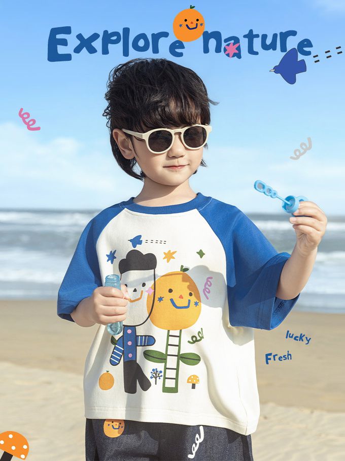 棉質圓領休閒短袖上衣-橘子樹好朋友-白/藍