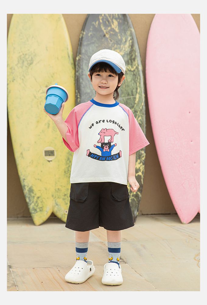 棉質圓領休閒短袖上衣-動物園遊會-拼袖粉