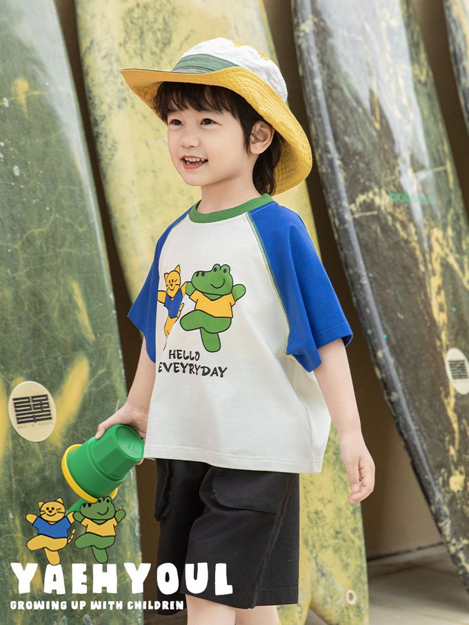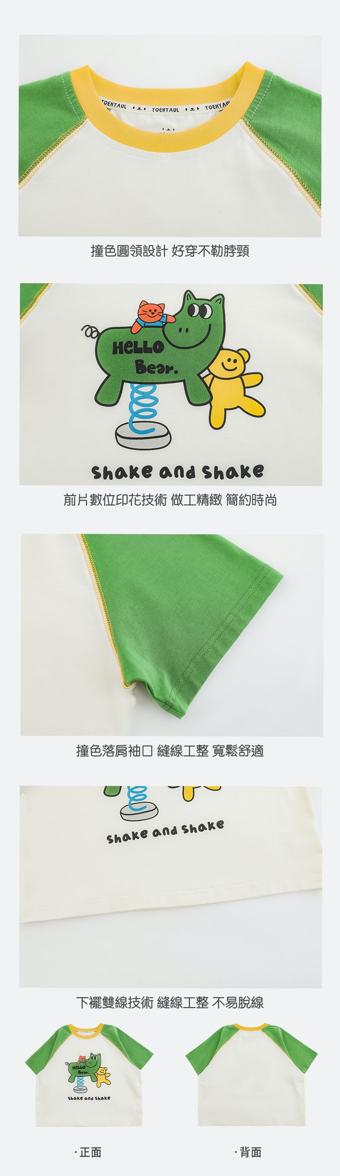 棉質圓領休閒短袖上衣-動物園遊會-拼袖藍