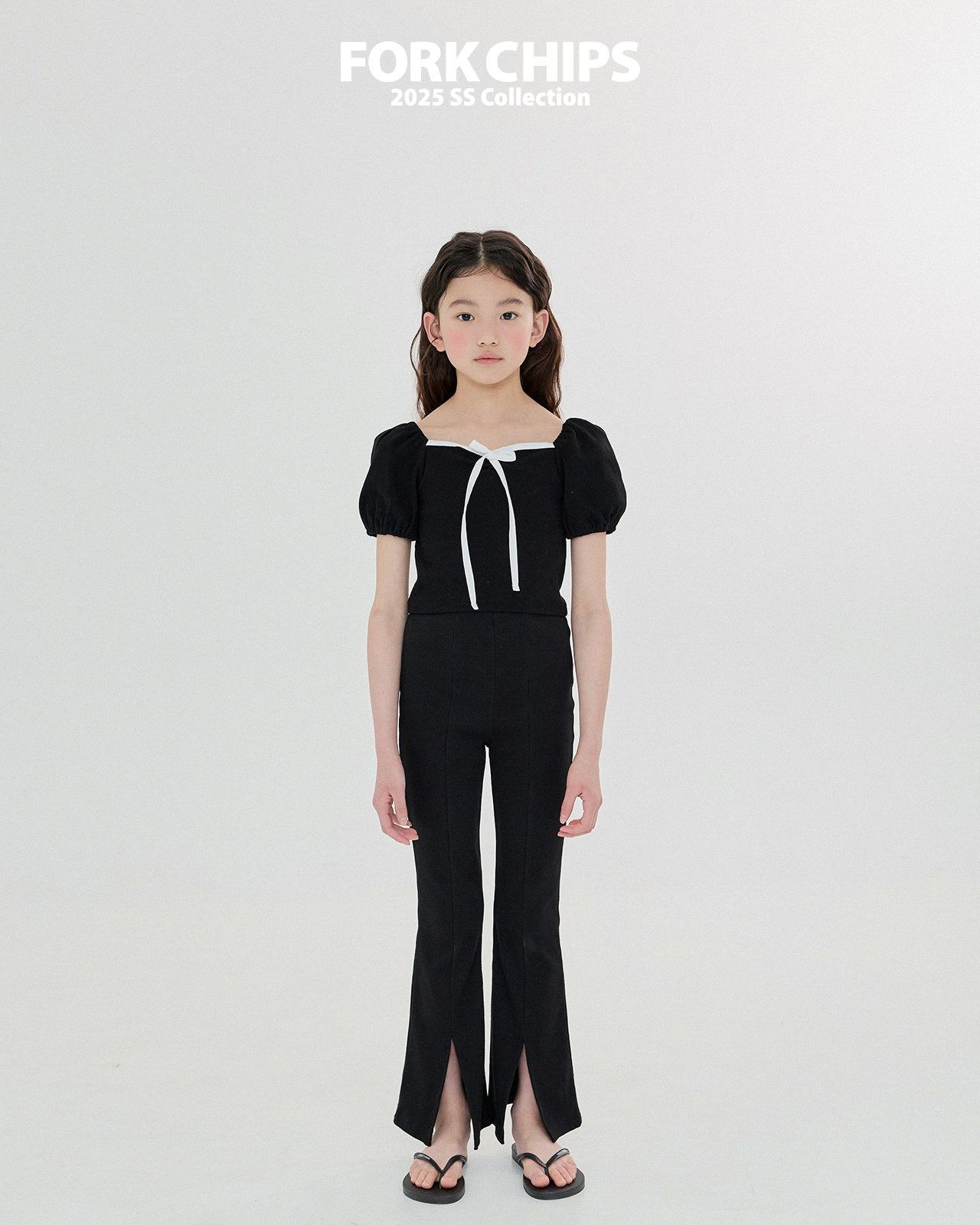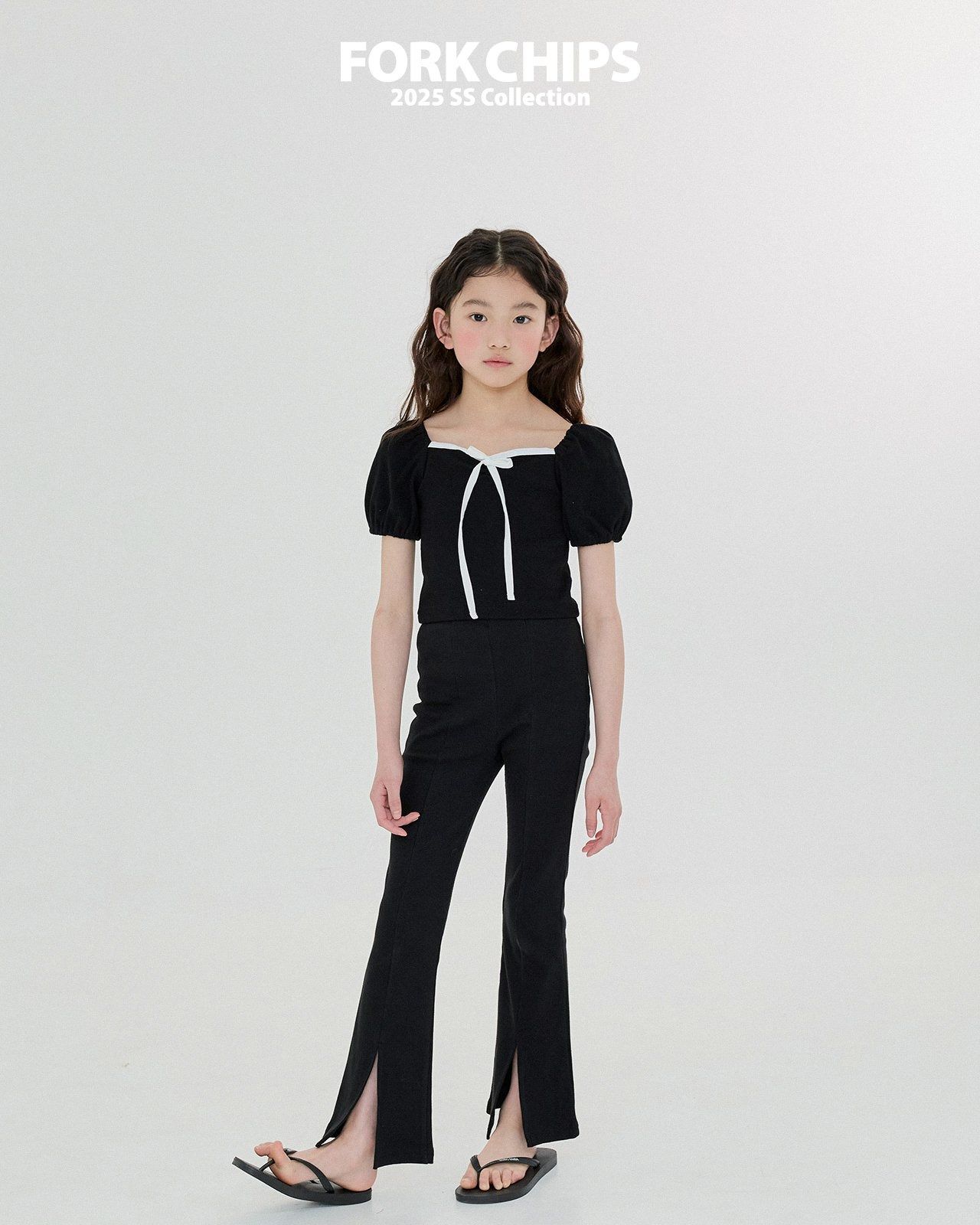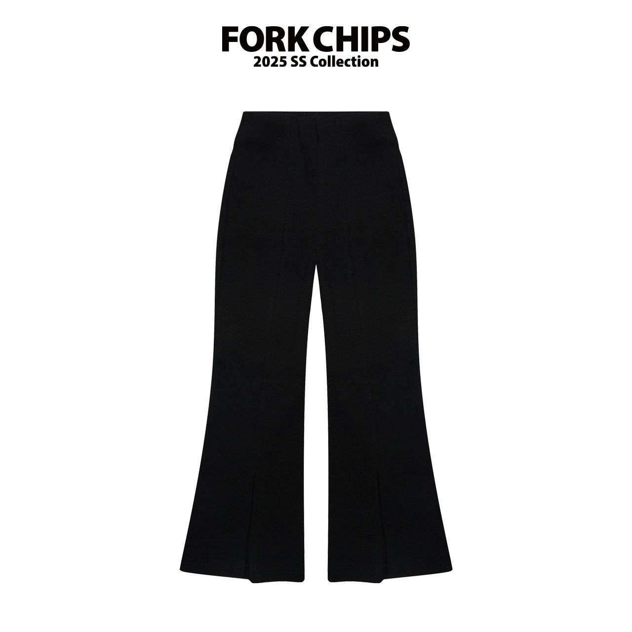 韓國 FORK CHIPS - 鬆緊腰羅紋開衩貼身喇叭褲-黑