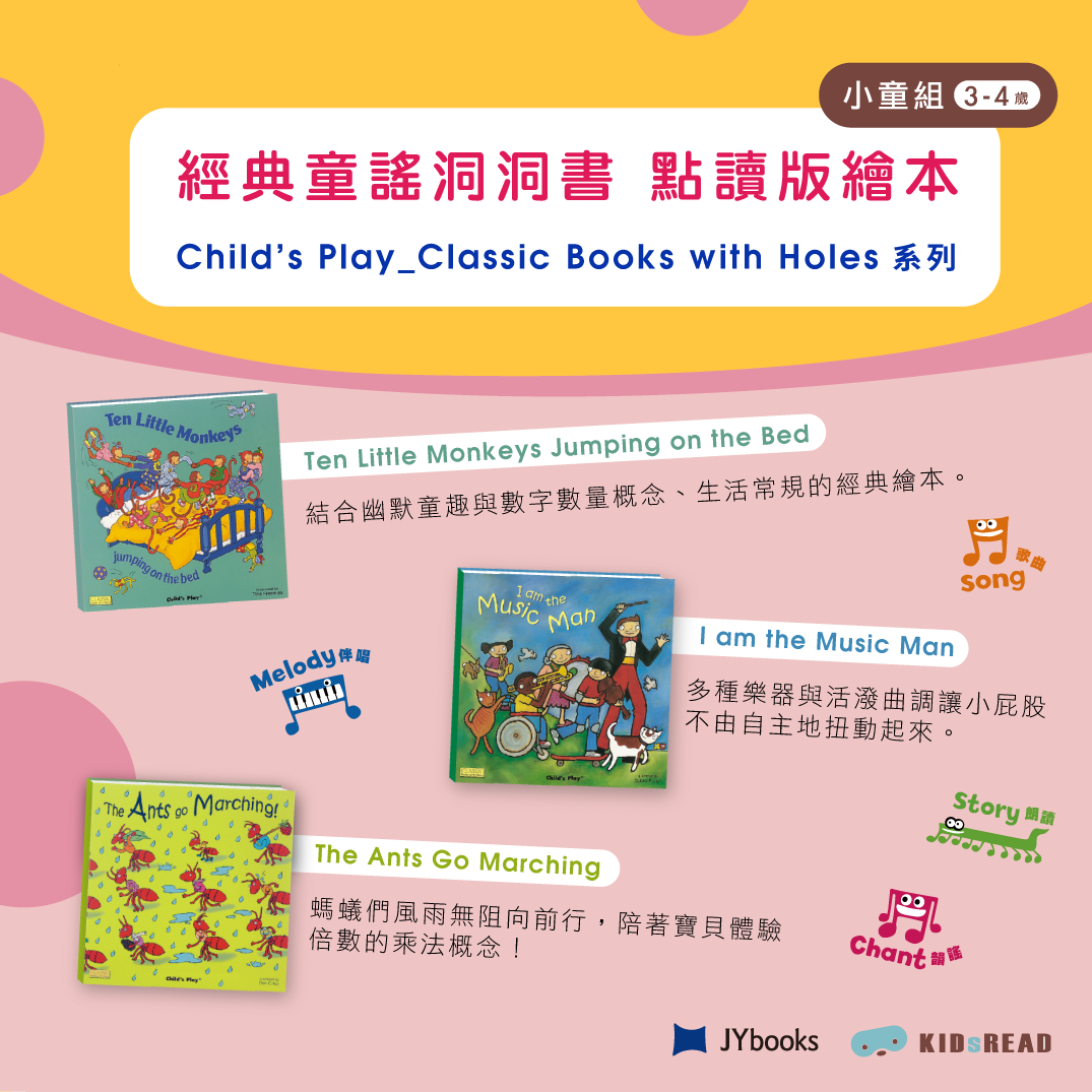 ▪生動有趣的Child’s Play童謠洞洞書(Classic Books with Holes)系列,畫面層層堆叠,讓孩子邊看邊挖掘驚喜小細節。