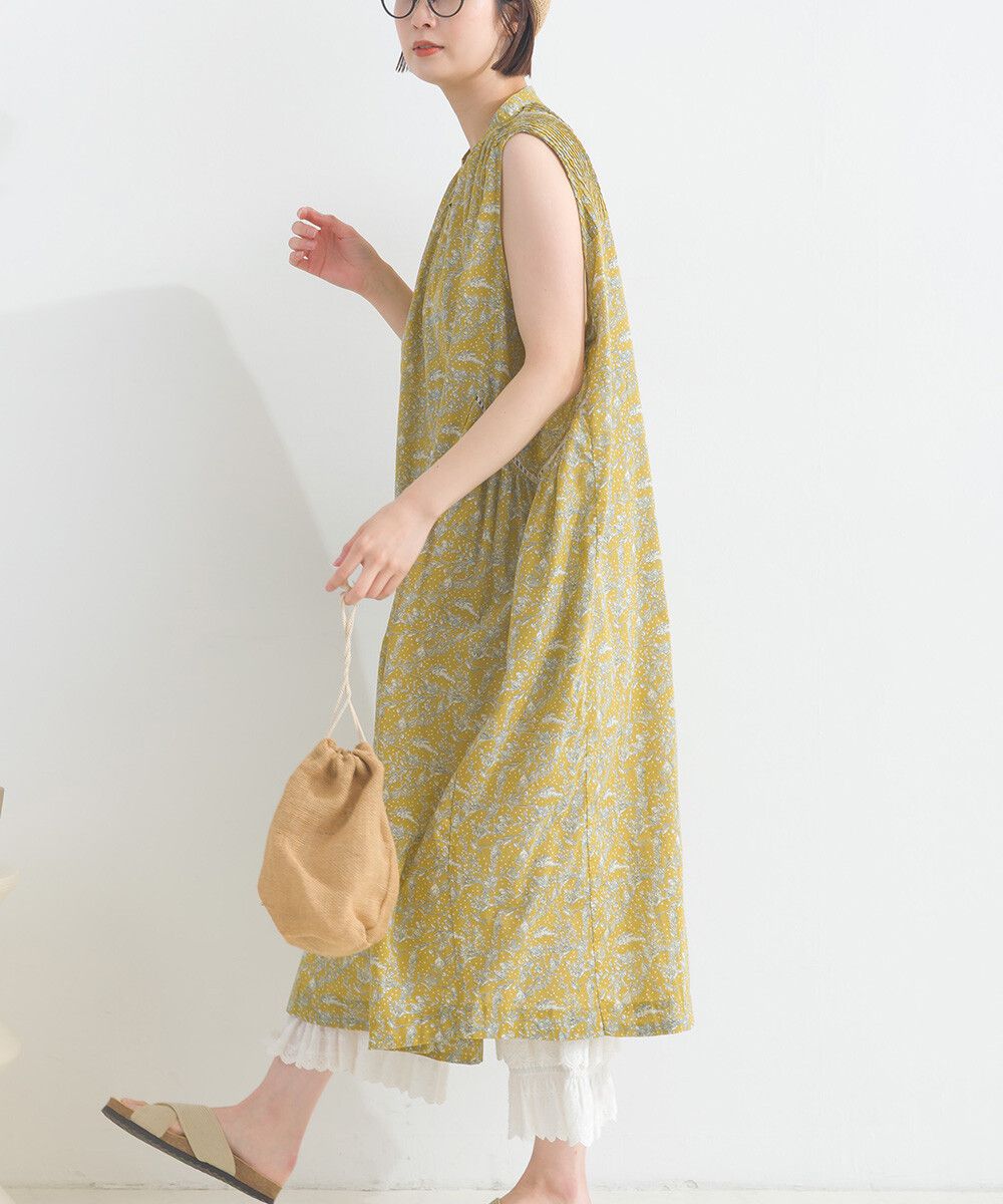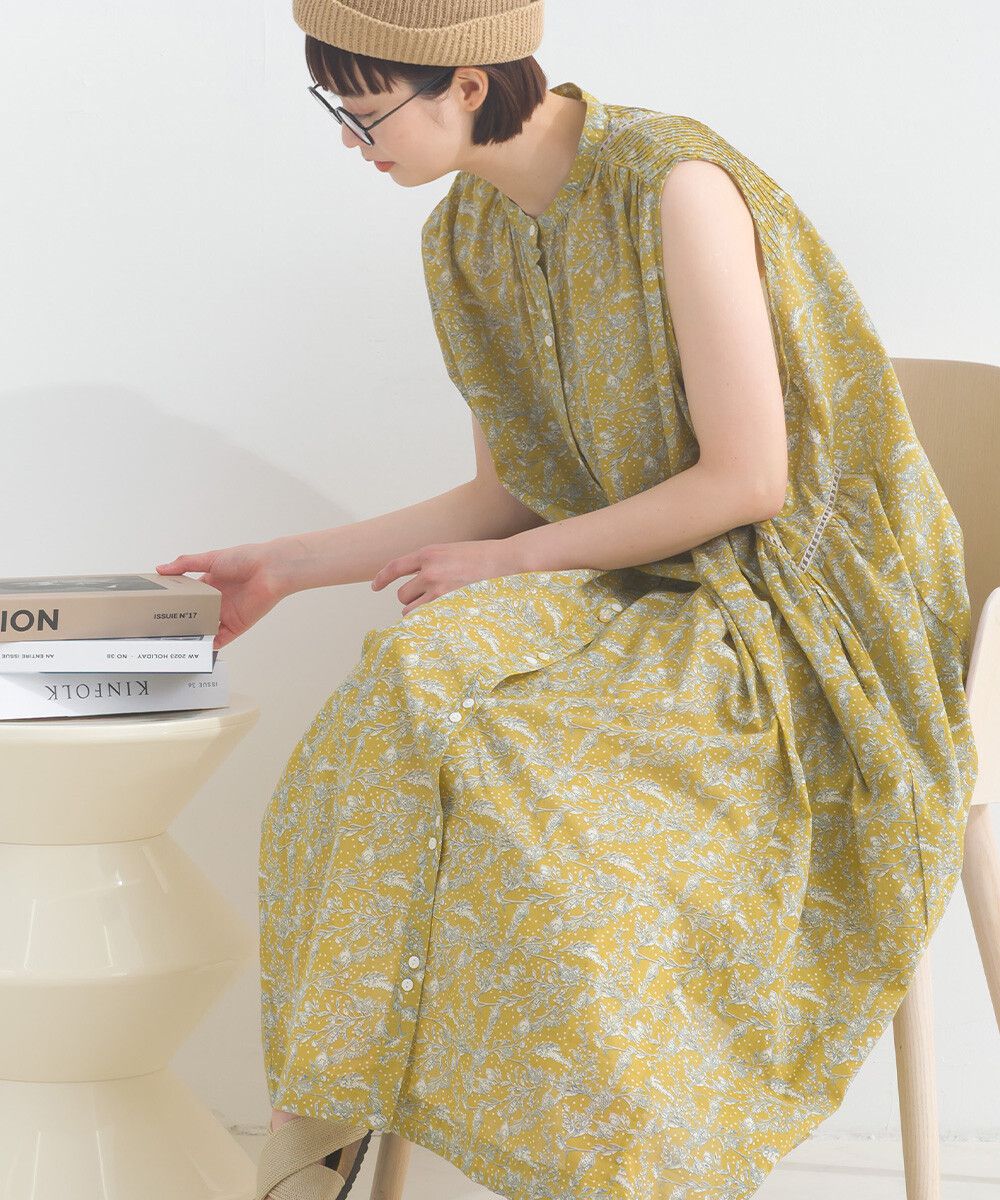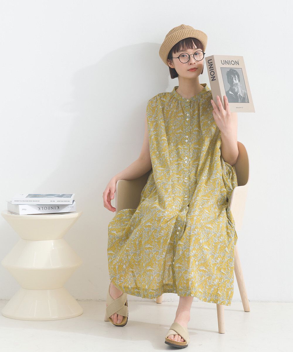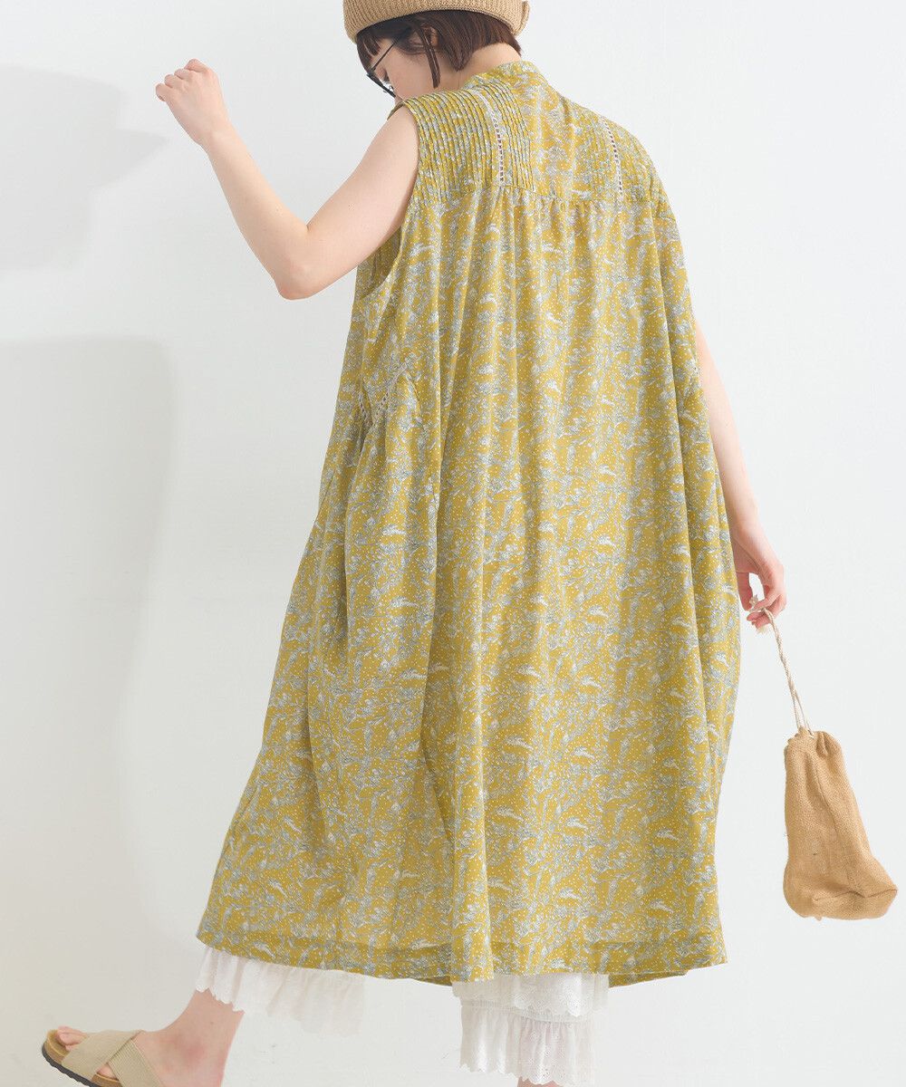 日本 Lupilien - 純棉清新植物印花襯衫式無袖洋裝-芥黃