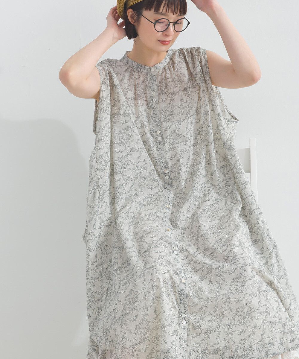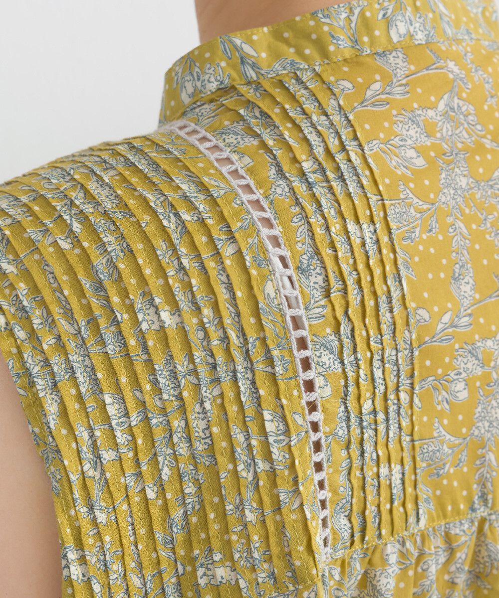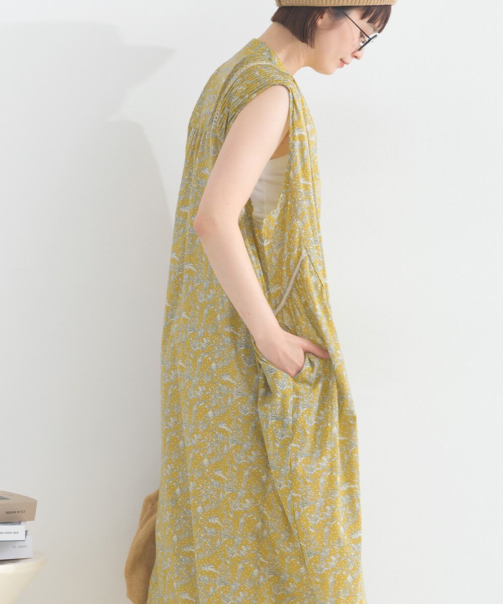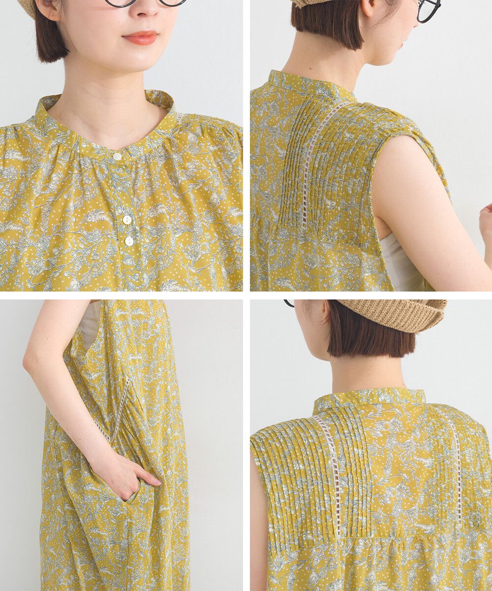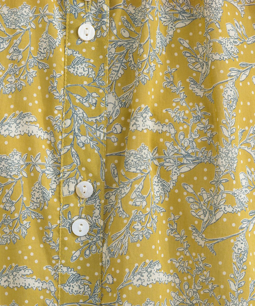 日本 Lupilien - 純棉清新植物印花襯衫式無袖洋裝-芥黃