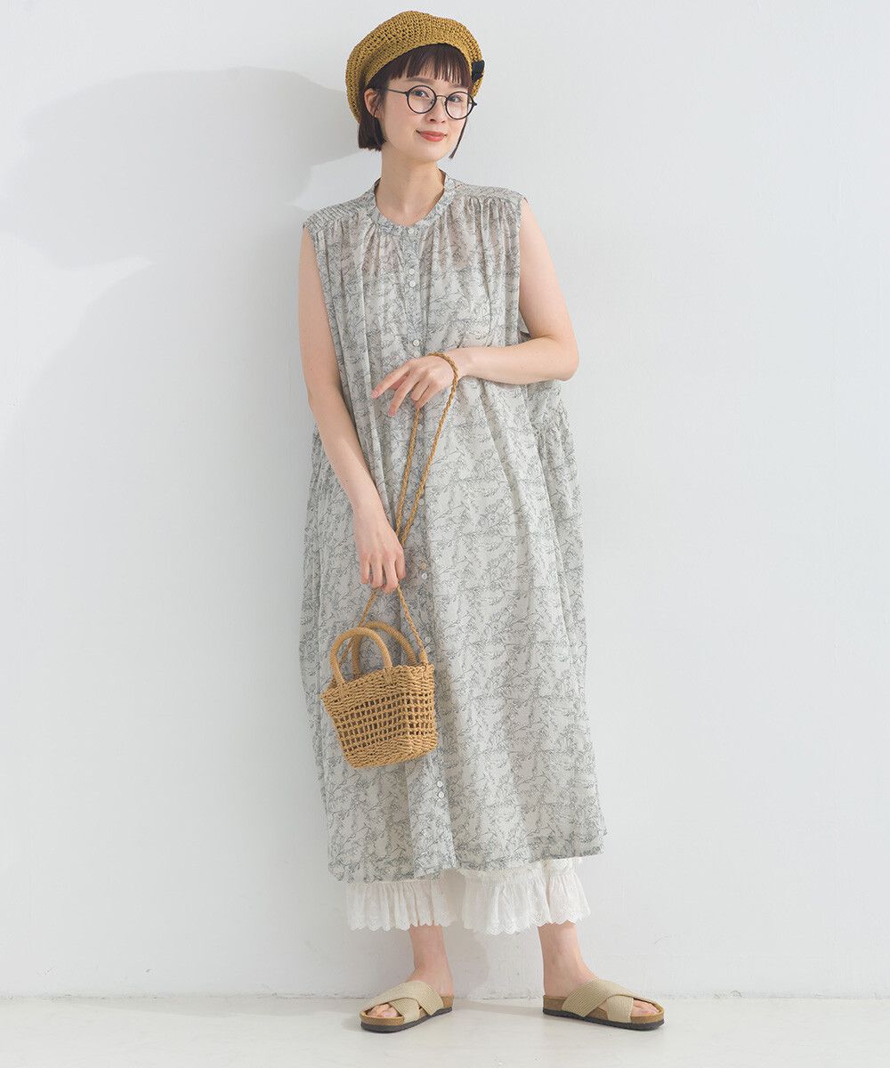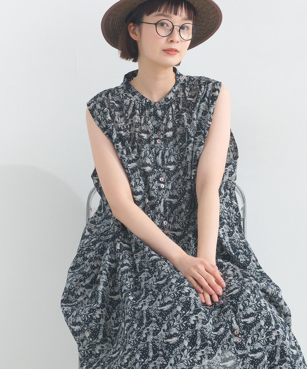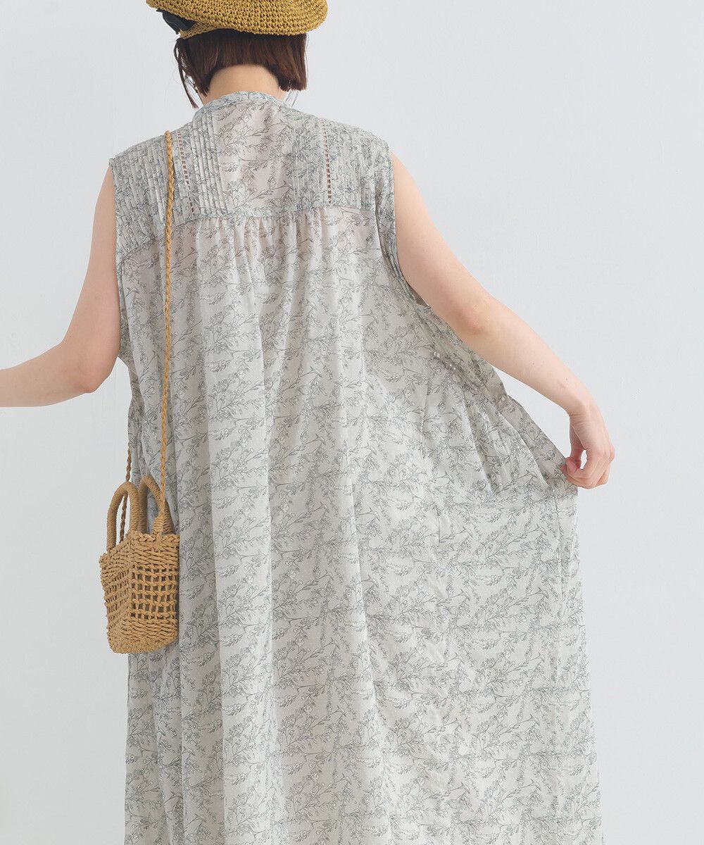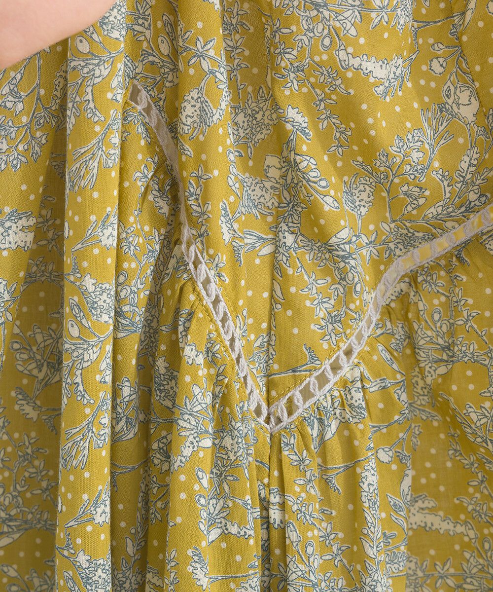 日本 Lupilien - 純棉清新植物印花襯衫式無袖洋裝-芥黃