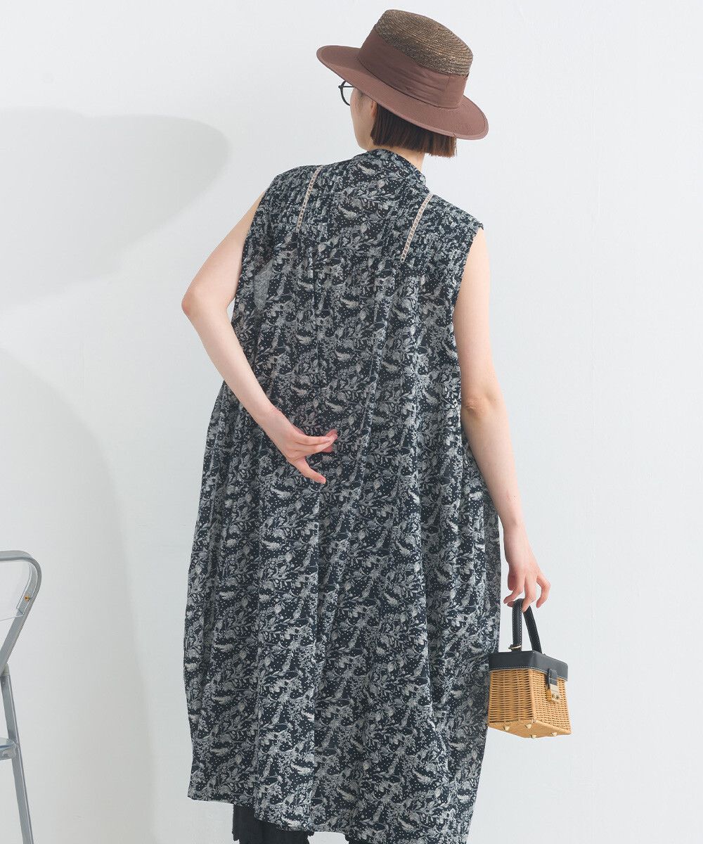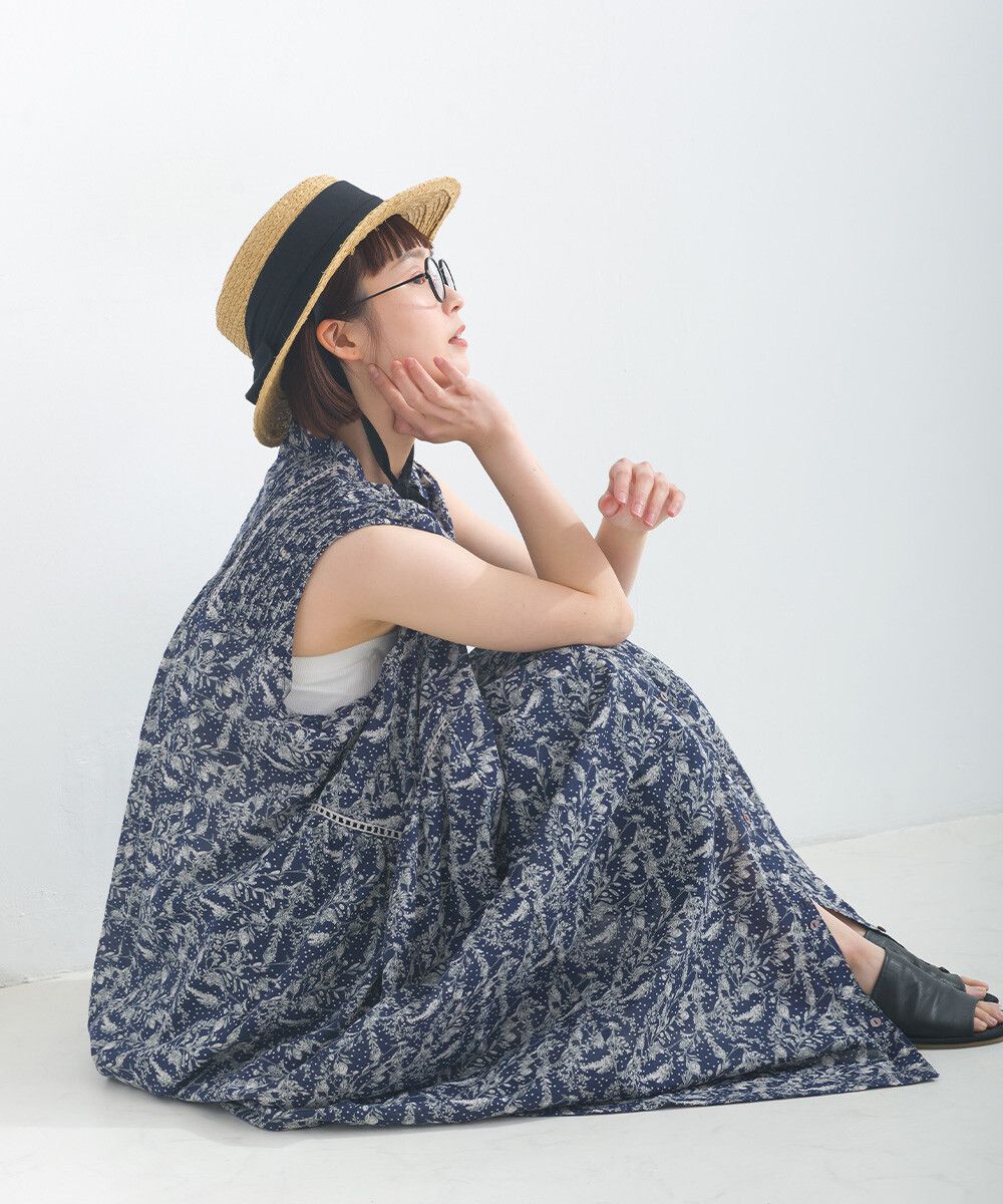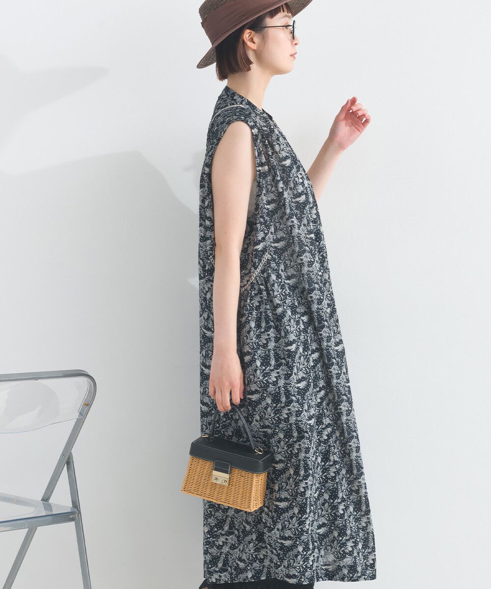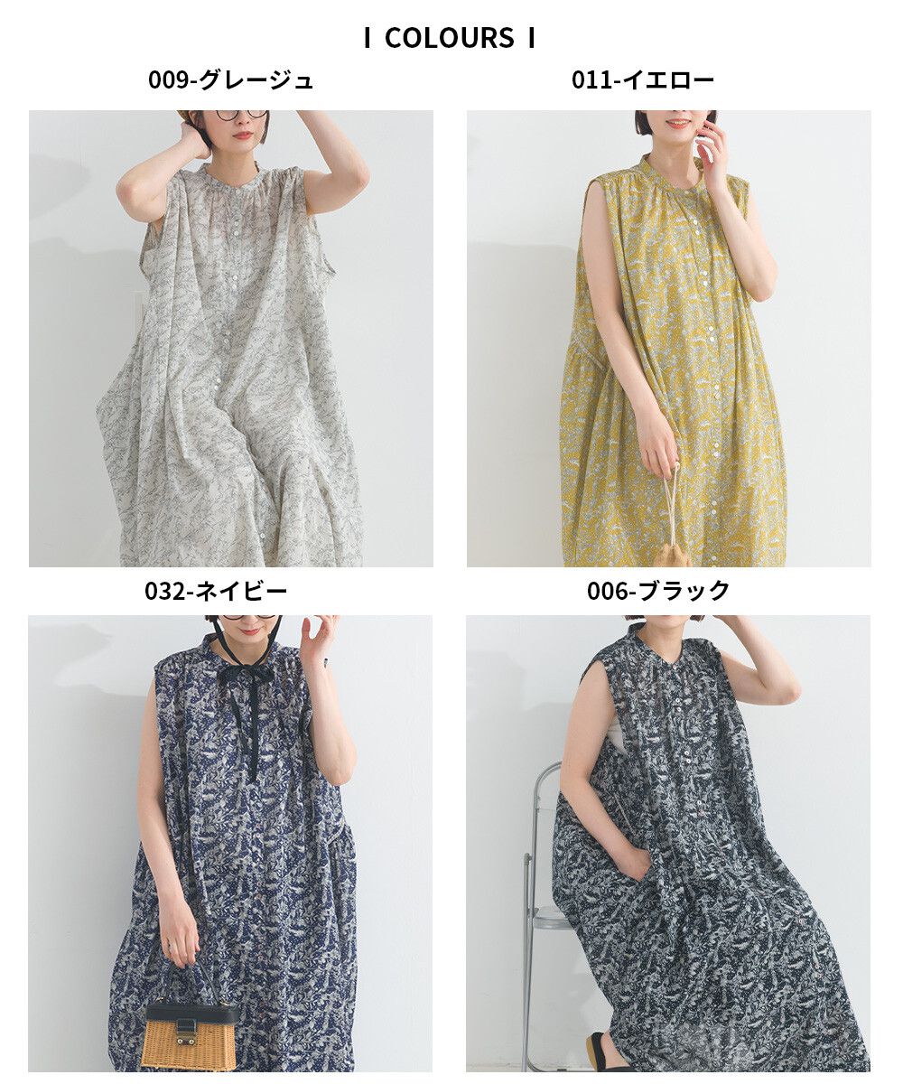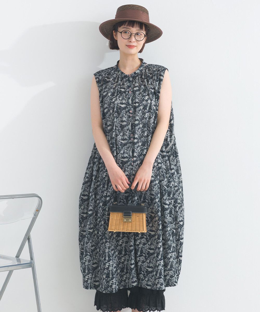 日本 Lupilien - 純棉清新植物印花襯衫式無袖洋裝-芥黃