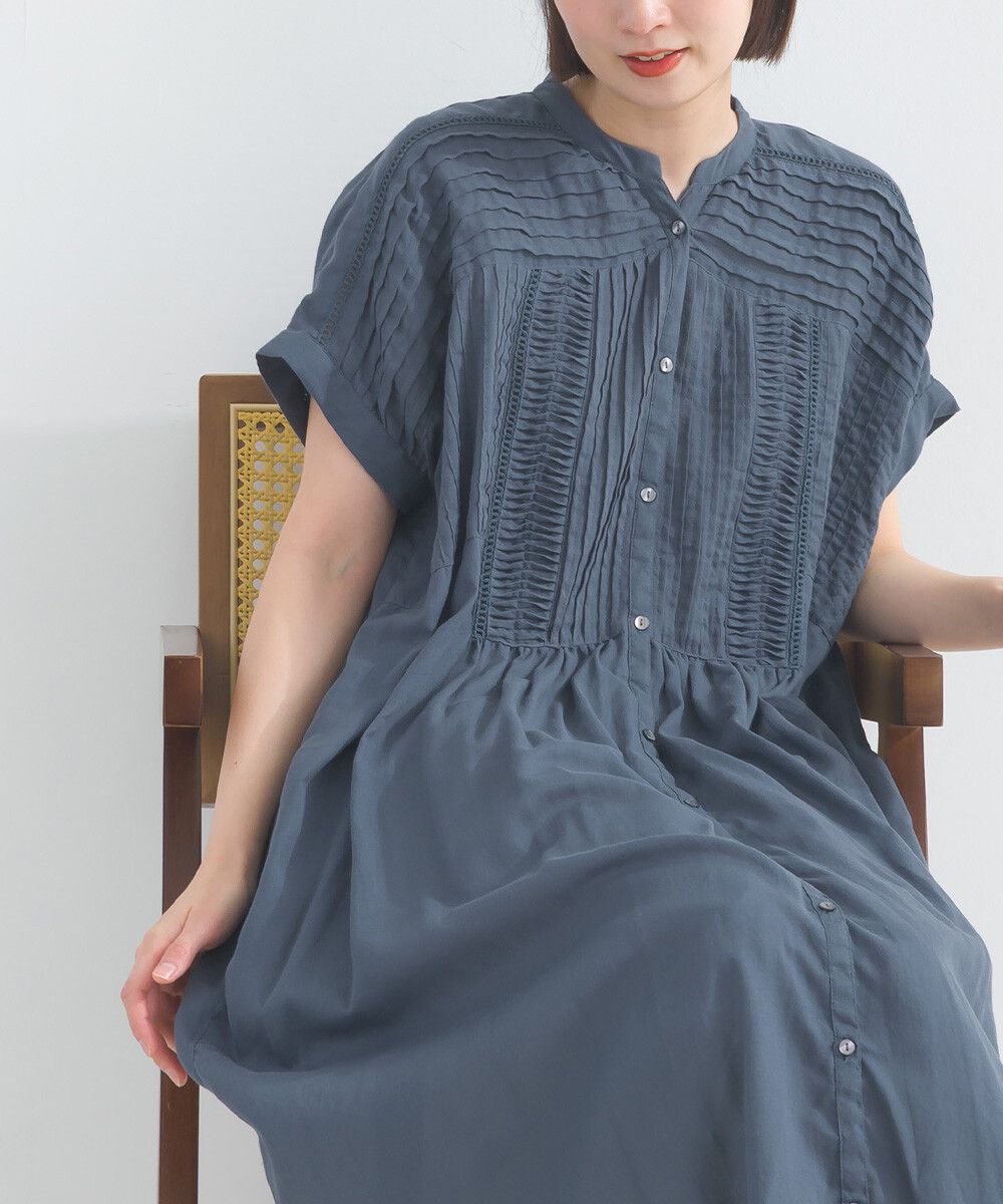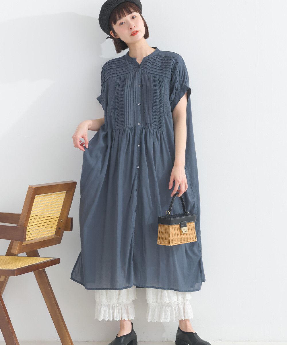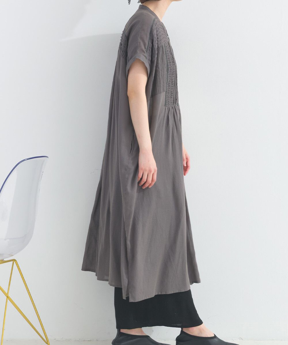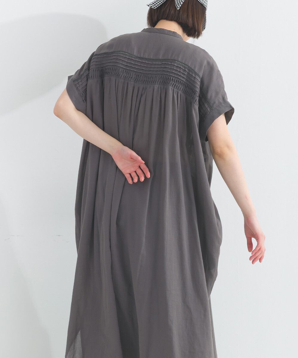日本 Lupilien - 100%棉 迷人皺摺襯衫式短袖洋裝-炭灰