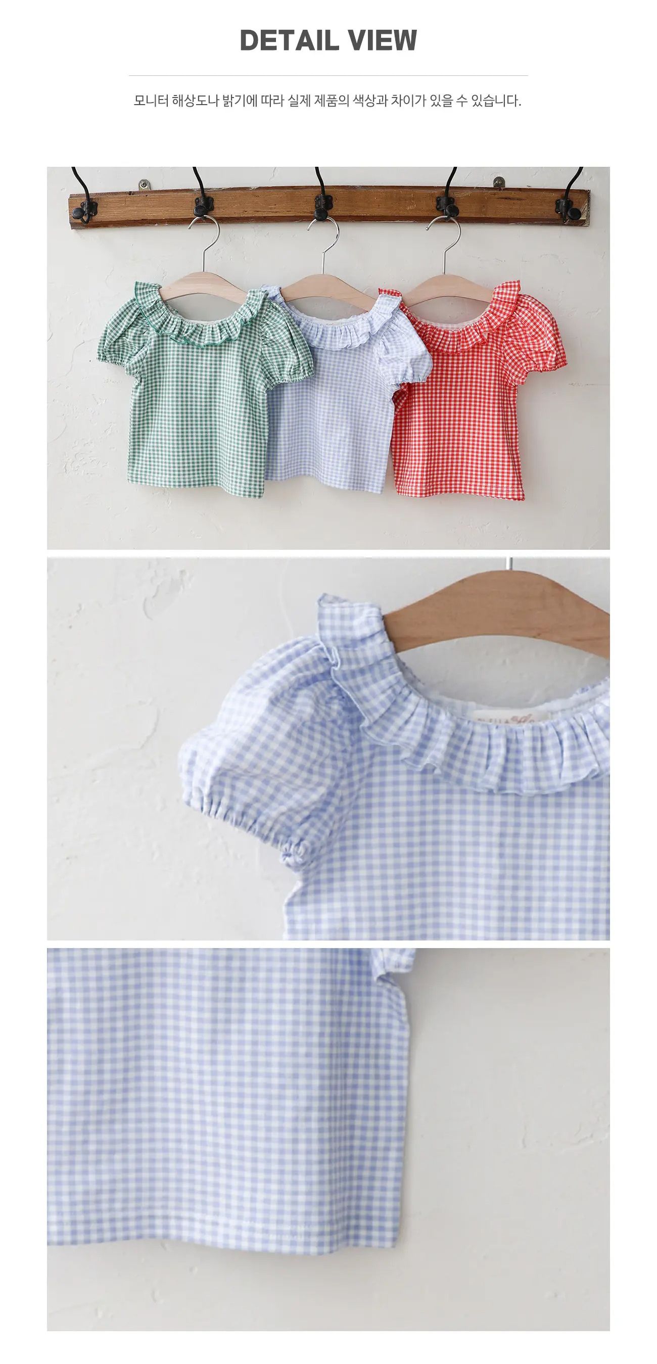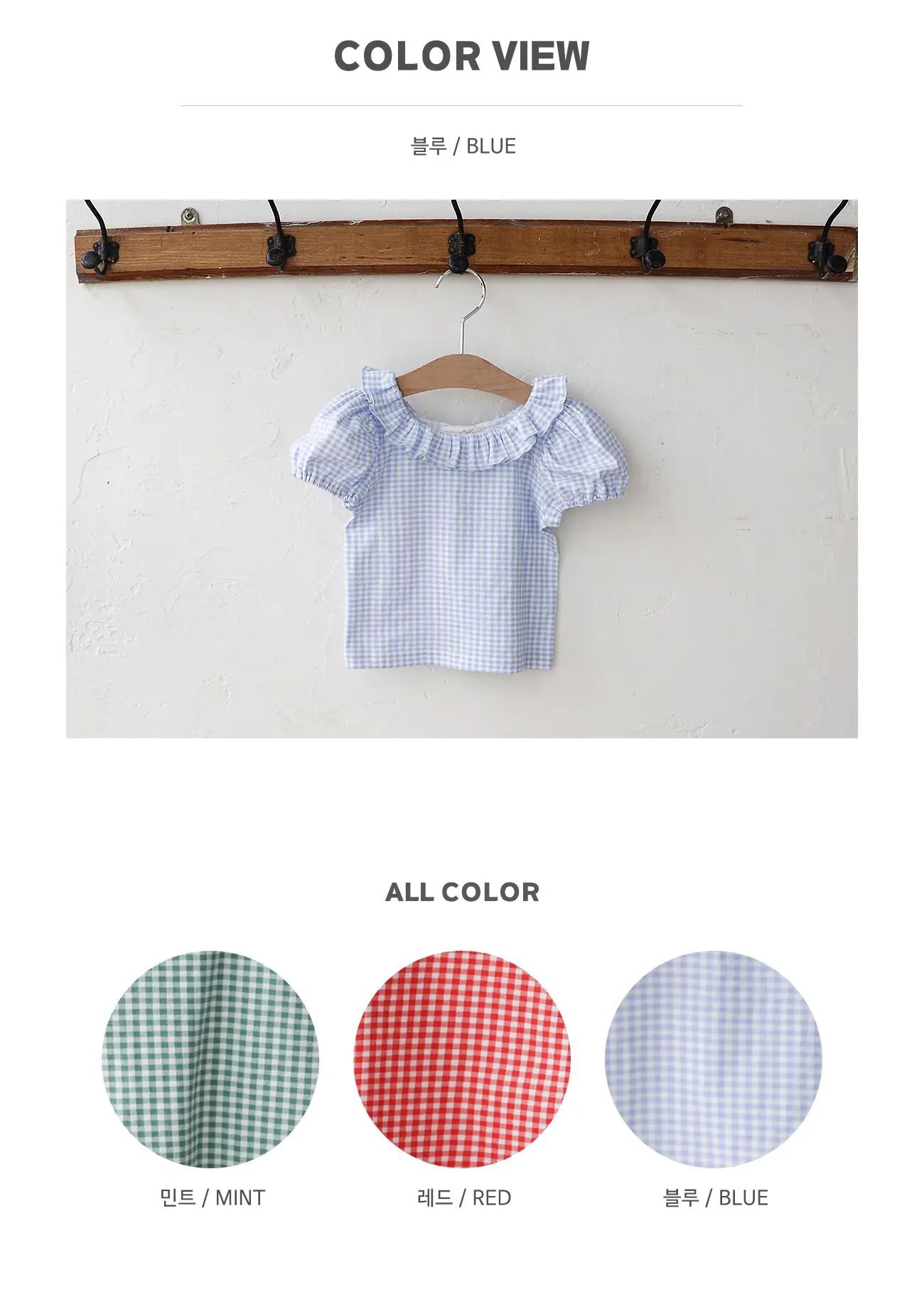 韓國 PuellaFLO - 可愛格紋荷葉領泡泡袖上衣-天藍