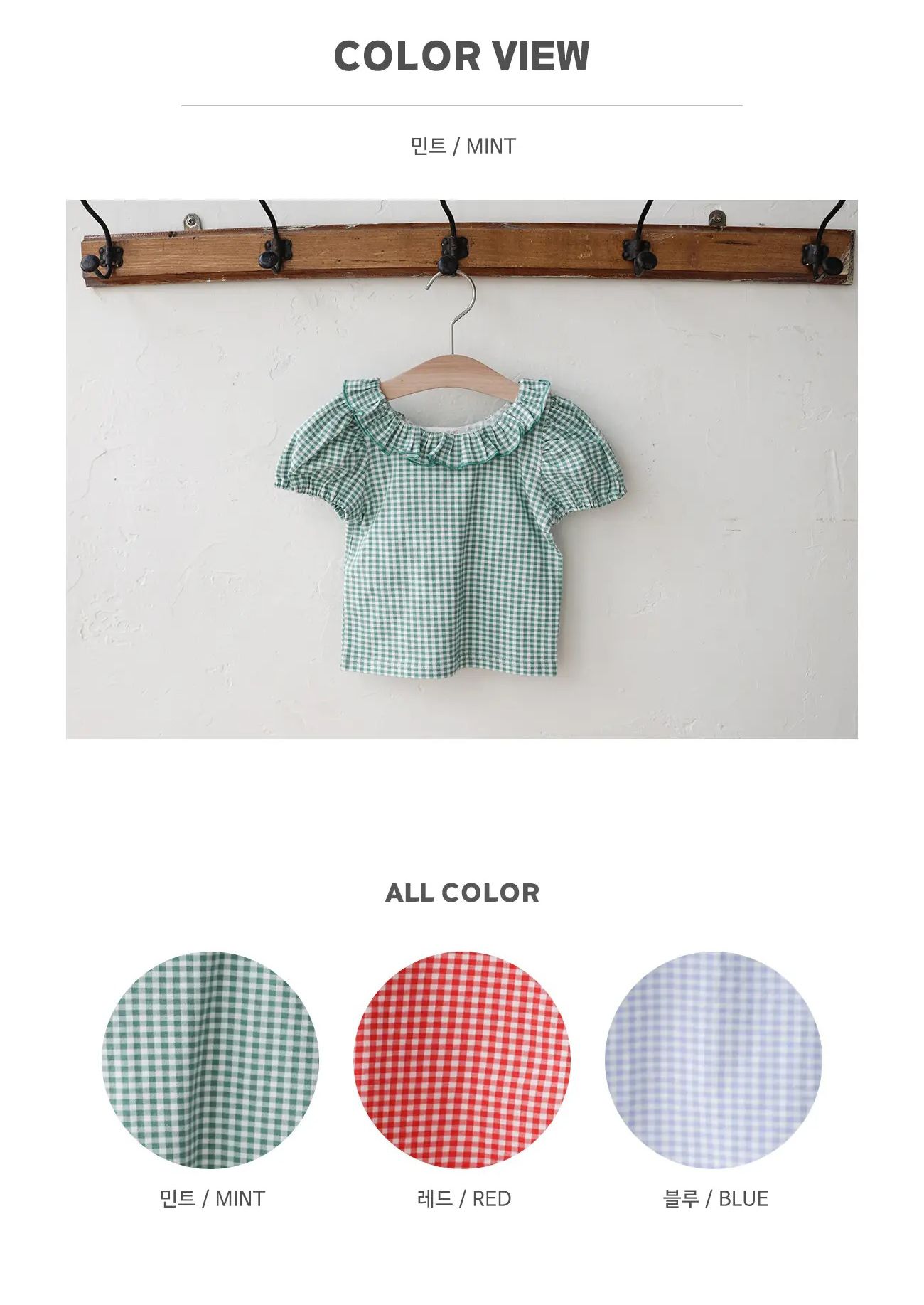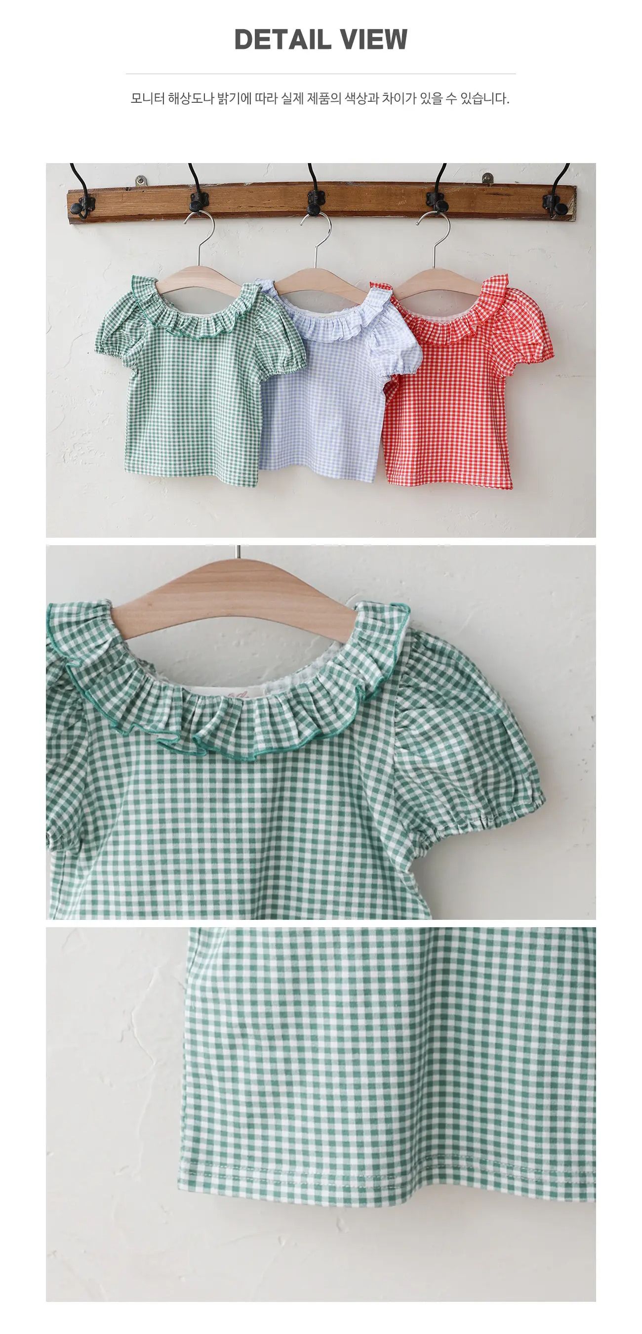 • 品名:可愛格紋荷葉領泡泡袖上衣