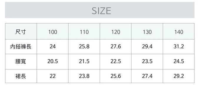 • 成分:裙子:100%棉,底褲:63%聚酯纖維+33%嫘縈+4%彈性纖維