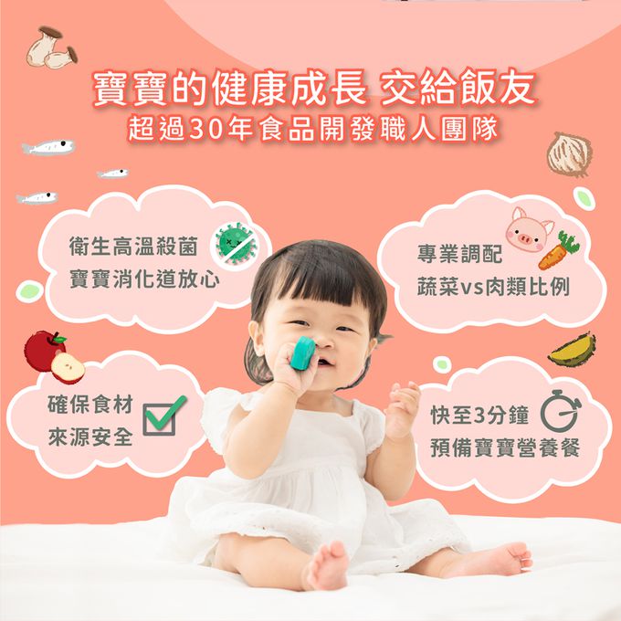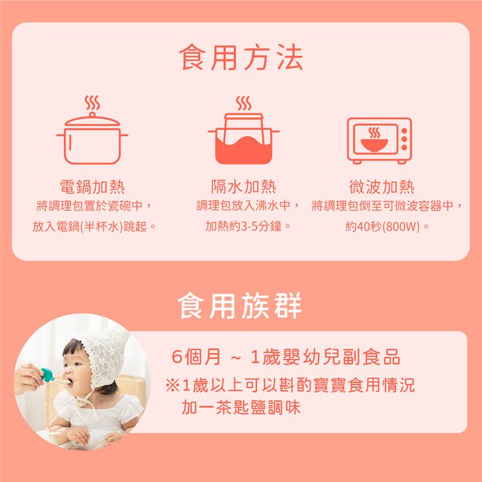 成分:蘋果小豬寶寶粥:水、白米、酵素豬、紅蘿蔔、蘋果、青花菜 南瓜小雞寶寶粥:水、白米、雞肉、南瓜、山藥、青花菜 彩椒菇菇寶寶粥:水、白米、南瓜、彩椒(甜椒)、杏鮑菇 *白米無使用農藥及化學肥料*