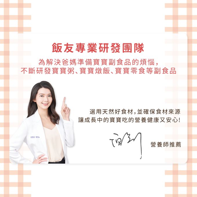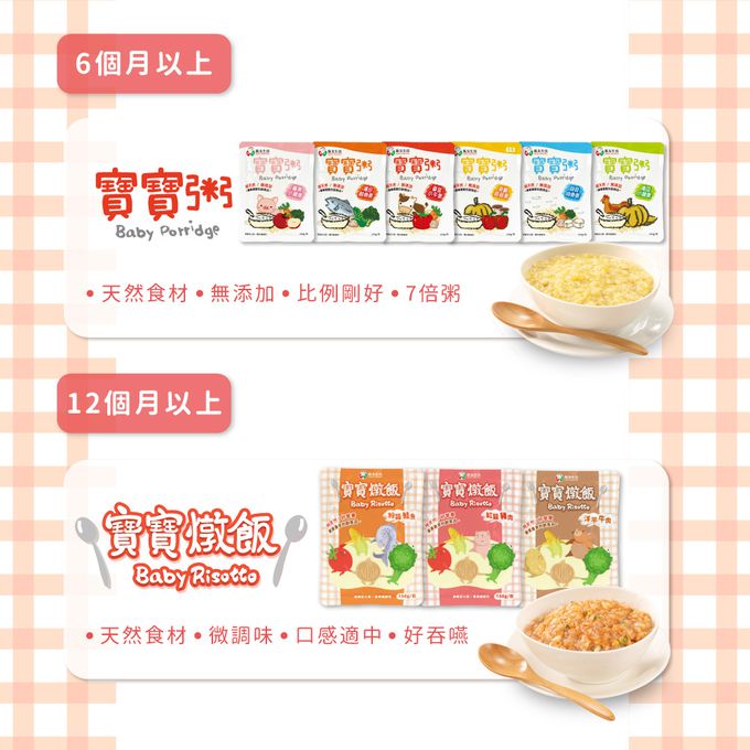 成分:紅醬豬肉寶寶燉飯:水、白米、豬肉、蕃茄、青花菜、無鹽奶油(殺菌乳脂(來自牛乳)、水分)、玉米、蕃茄糊、洋蔥、初榨酪梨油、鹽 洋芋牛肉寶寶燉飯:水、白米、牛奶、牛肉、馬鈴薯、青花菜、洋蔥、無鹽奶油(殺菌乳脂(來自牛乳)、水分)、玉米、初榨酪梨油、鹽
