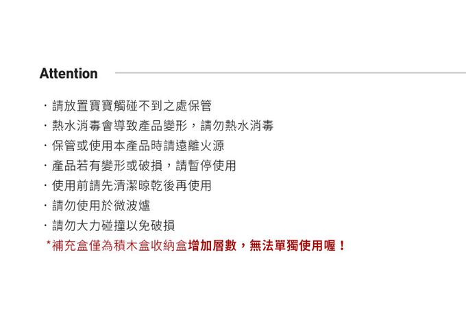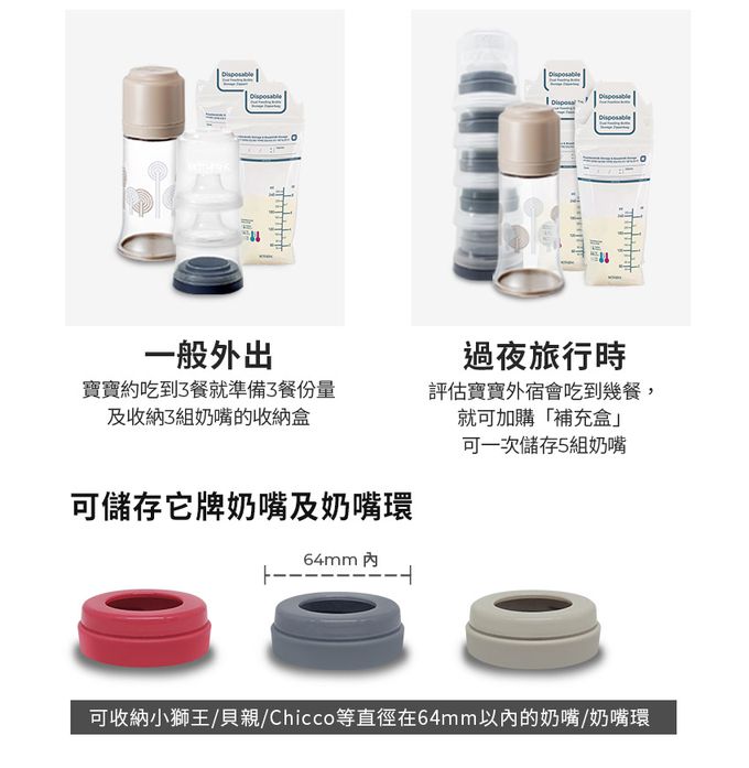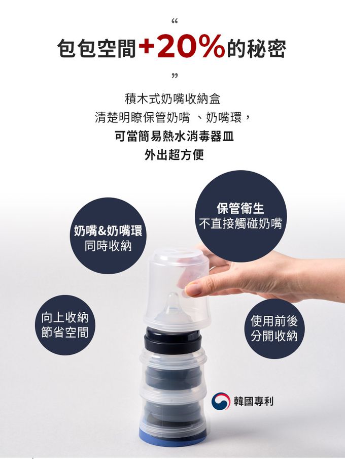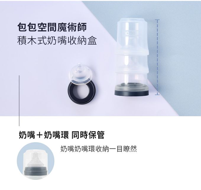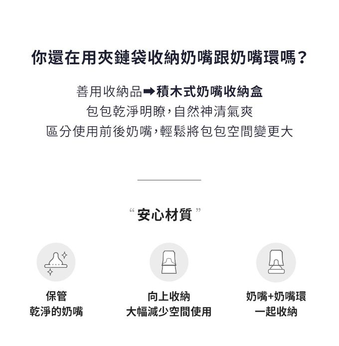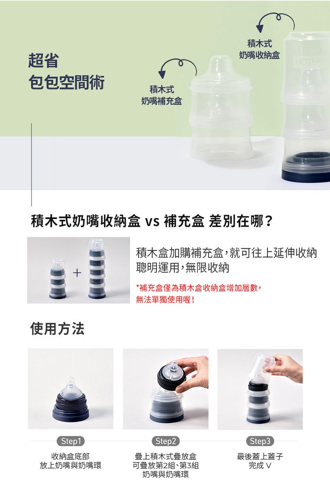A:積木式奶嘴收納盒可收納3組奶嘴與奶嘴環,若是覺得3組不夠,可再購買積木式奶嘴收納補充盒(可收納2組奶嘴與奶嘴環),積木式奶嘴收納補充盒無法單獨使用,需先購買積木式奶嘴收納盒