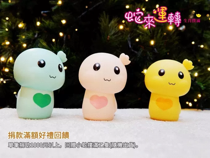 凡單筆捐助1,000元以上,幫助小朋友有穩定的愛心早餐,世界和平會即回贈【小蛇撲滿】乙只 (隨機出貨),讓靈動又可愛的蛇家三兄妹希望陪伴您的生活、課業與事業一帆風順!。