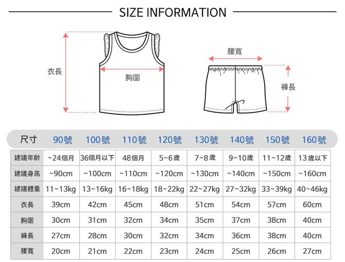 1. 尺寸表單位皆為公分(cm),實際尺寸會因布料彈性、水洗、測量起迄點等因素略有誤差。建議參考孩子平時穿著衣物尺寸進行選購。