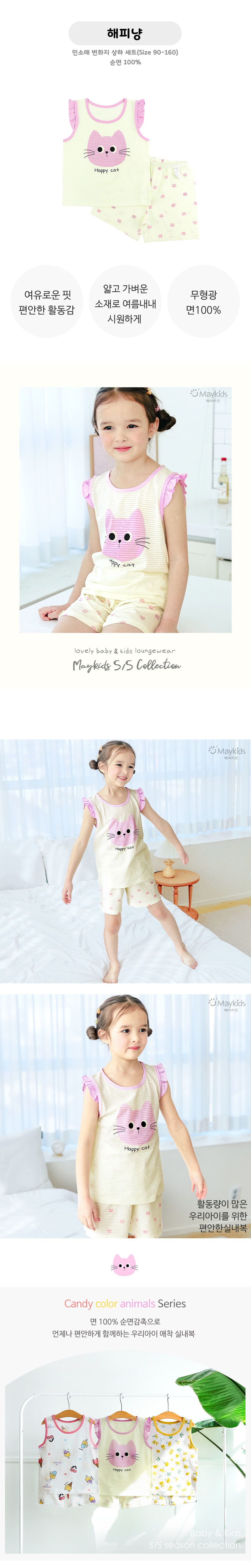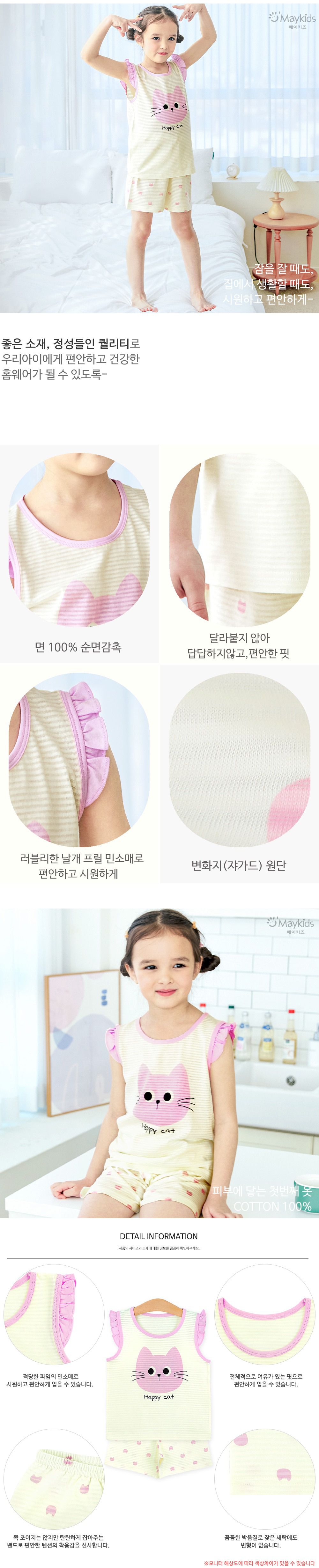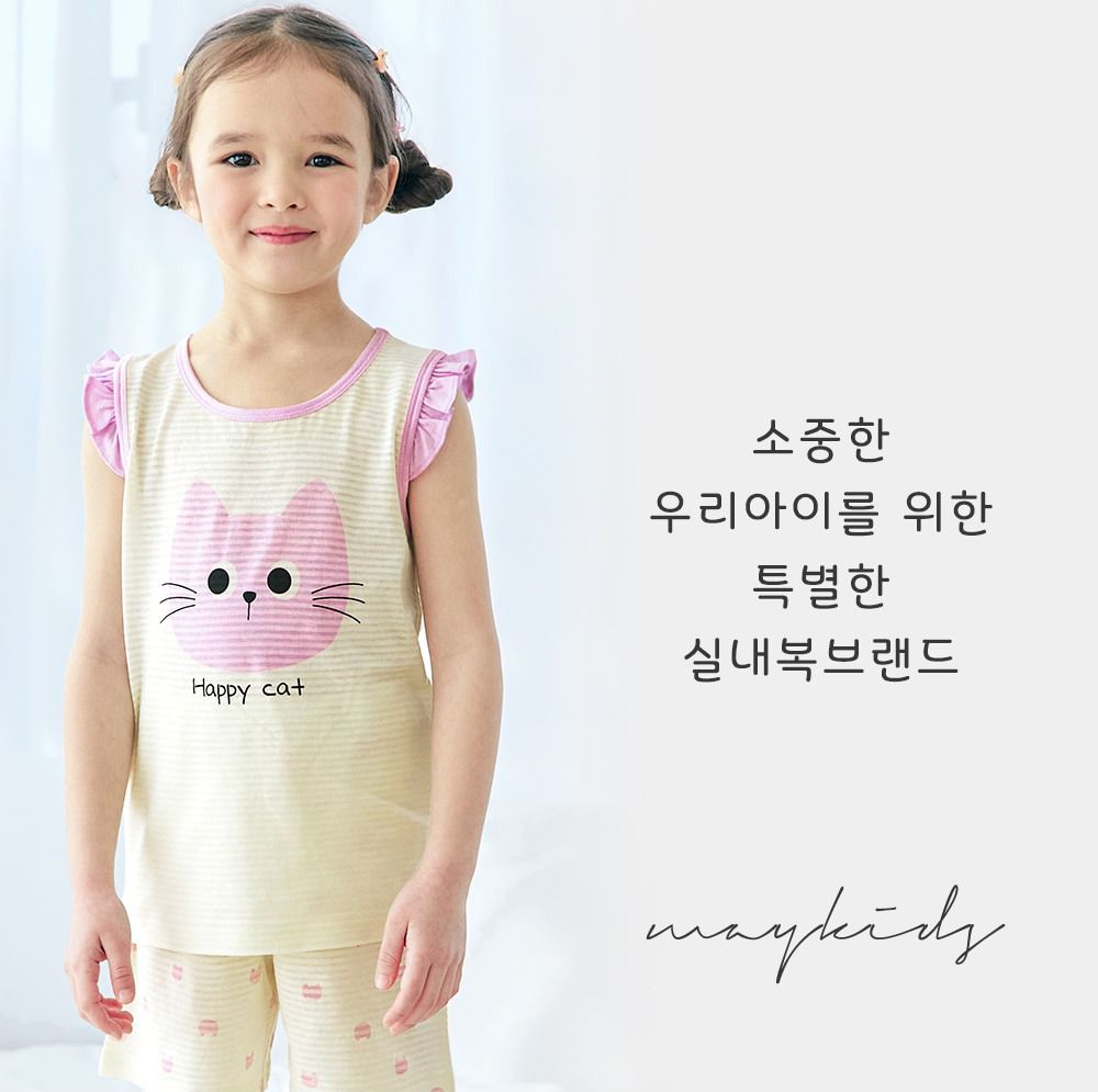 韓國 Maykids - 透氣條紋提花棉無袖家居服-快樂貓咪-淡黃X粉紫