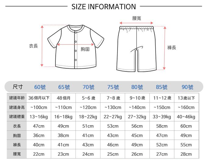 1. 尺寸表單位皆為公分(cm),實際尺寸會因布料彈性、水洗、測量起迄點等因素略有誤差。建議參考孩子平時穿著衣物尺寸進行選購。
