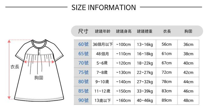1. 尺寸表單位皆為公分(cm),實際尺寸會因布料彈性、水洗、測量起迄點等因素略有誤差。建議參考孩子平時穿著衣物尺寸進行選購。