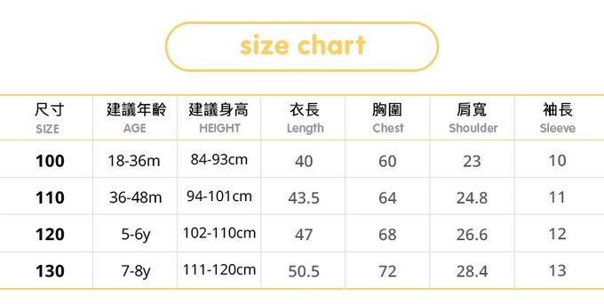 1. 尺寸表單位皆為公分(cm),實際尺寸會因布料彈性、水洗、測量起迄點等因素略有誤差。建議參考孩子平時穿著衣物尺寸進行選購。