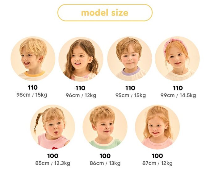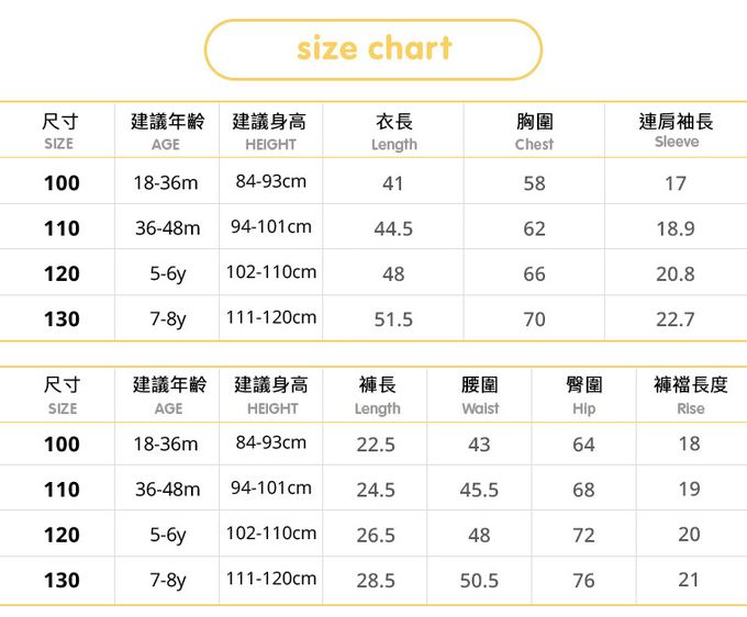 1. 尺寸表單位皆為公分(cm),實際尺寸會因布料彈性、水洗、測量起迄點等因素略有誤差。建議參考孩子平時穿著衣物尺寸進行選購。