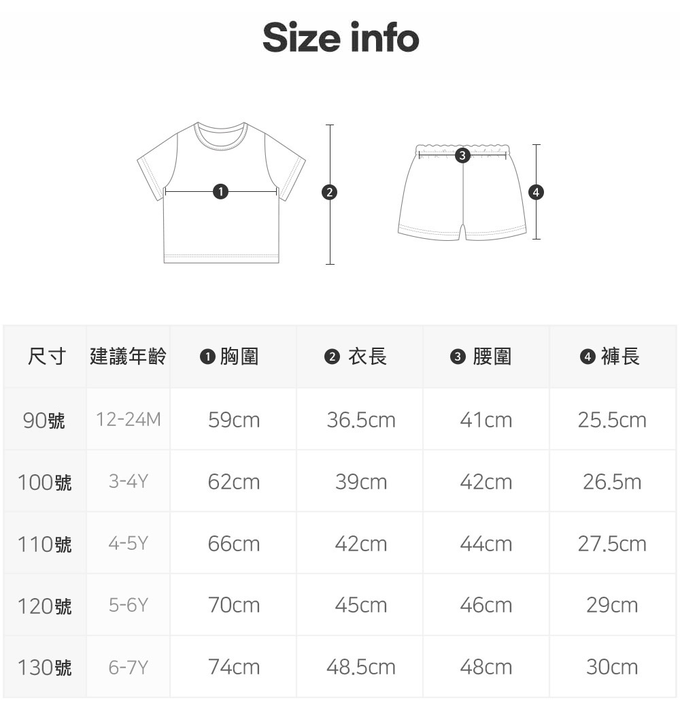 1. 尺寸表單位皆為公分(cm),實際尺寸會因布料彈性、水洗、測量起迄點等因素略有誤差。