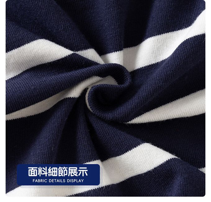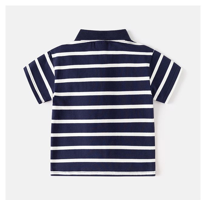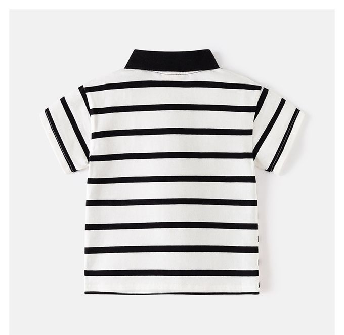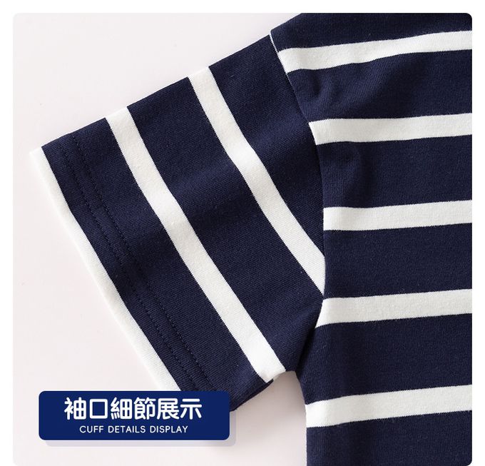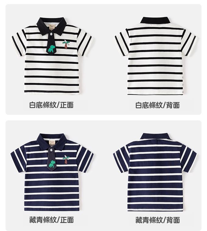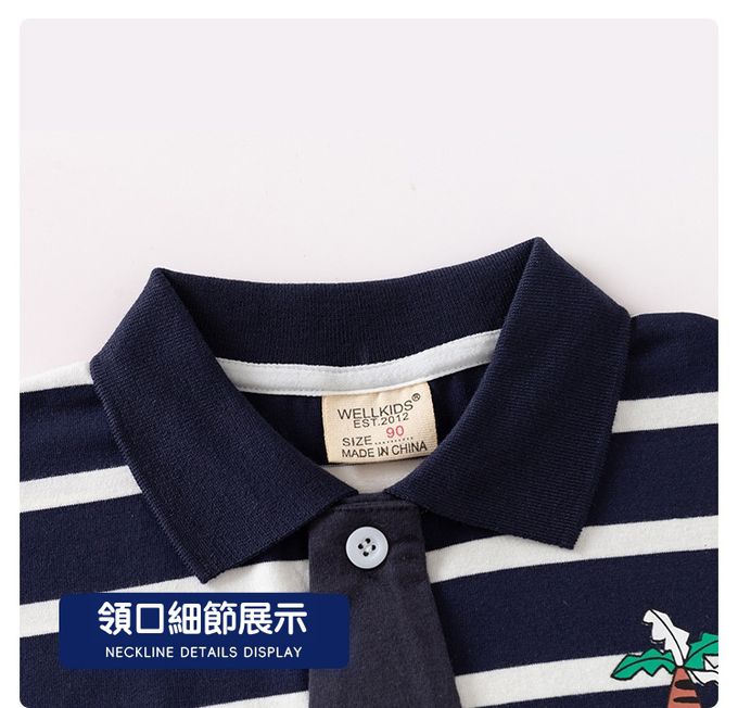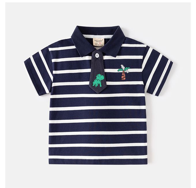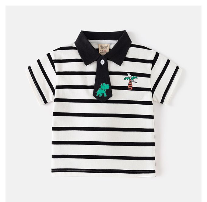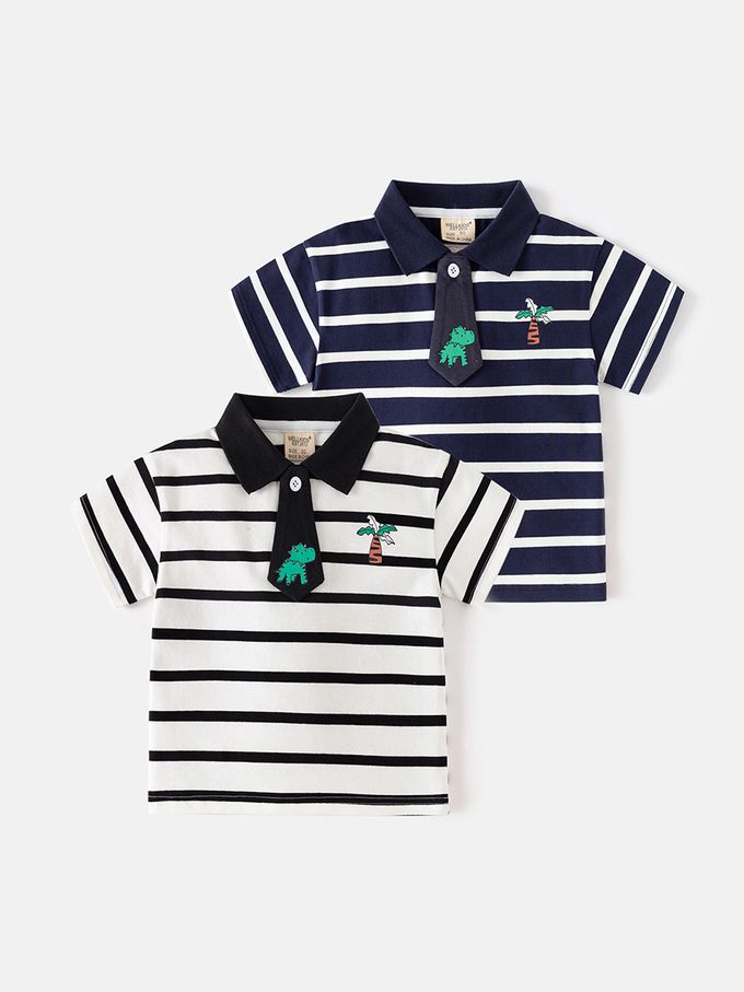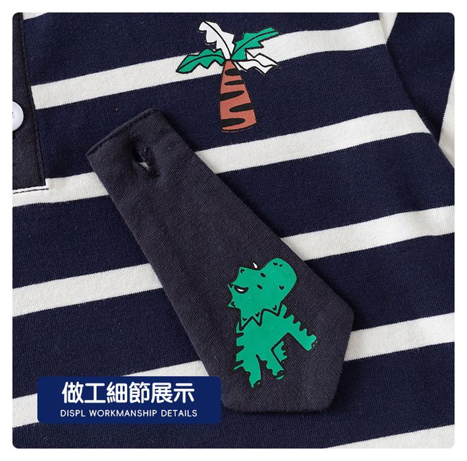 休閒翻領短袖上衣-恐龍領帶-白底條紋