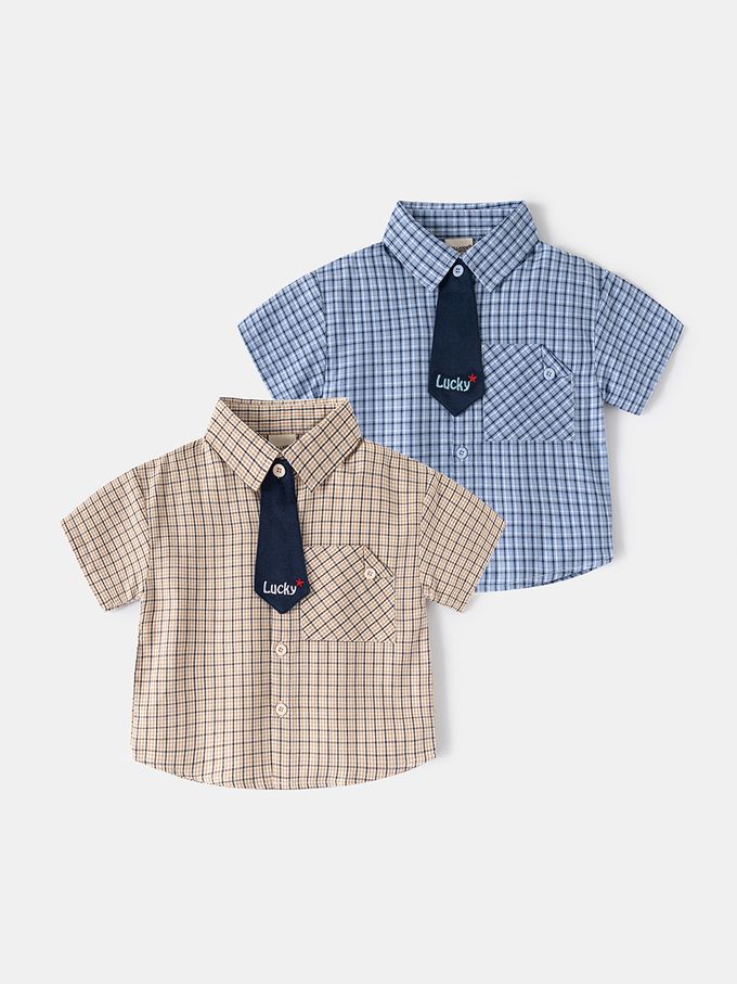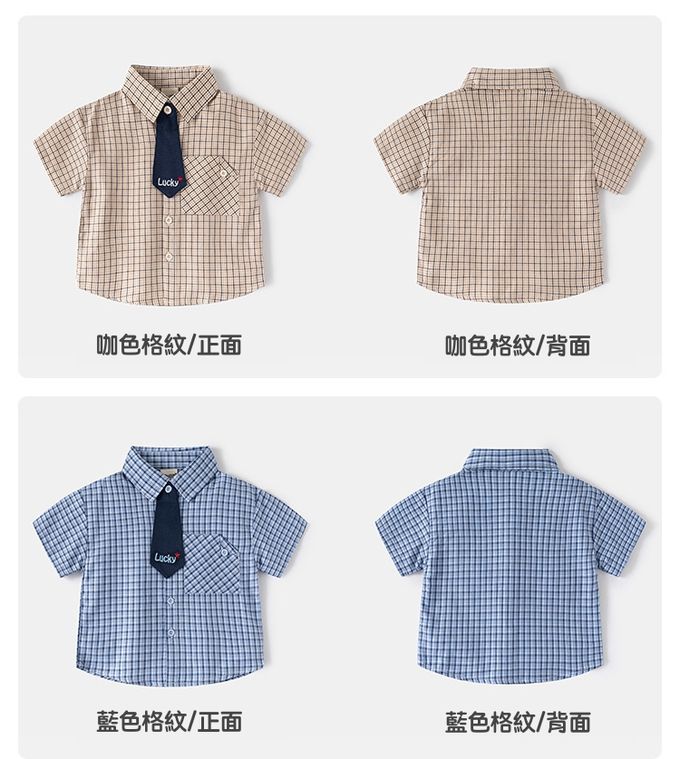 純棉休閒翻領短袖襯衫-小領帶-咖色格紋