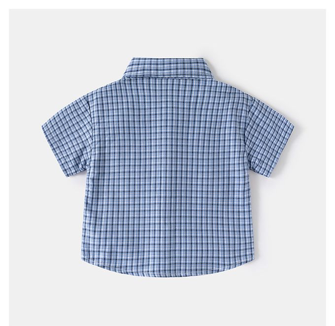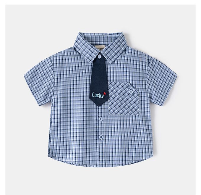 WELLKIDS - 純棉休閒翻領短袖襯衫-紳士小領帶-藍色條紋