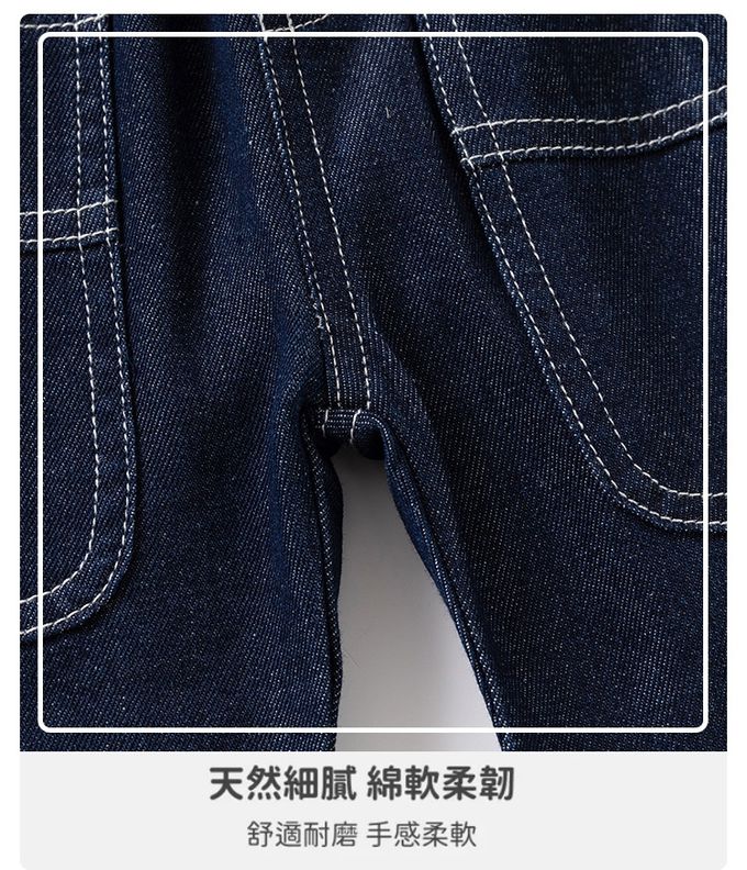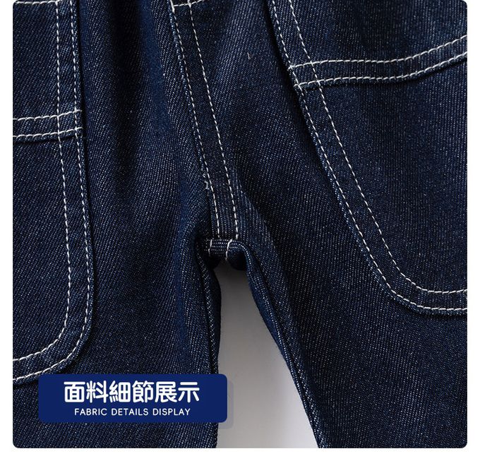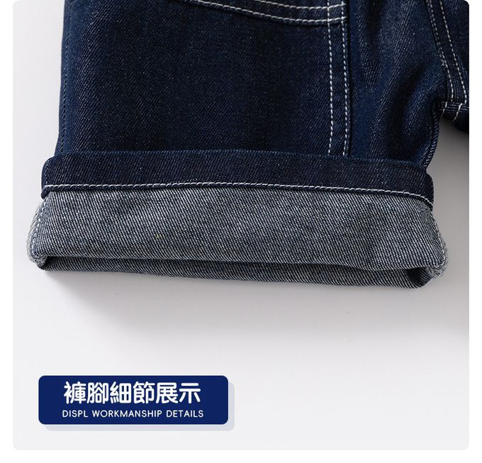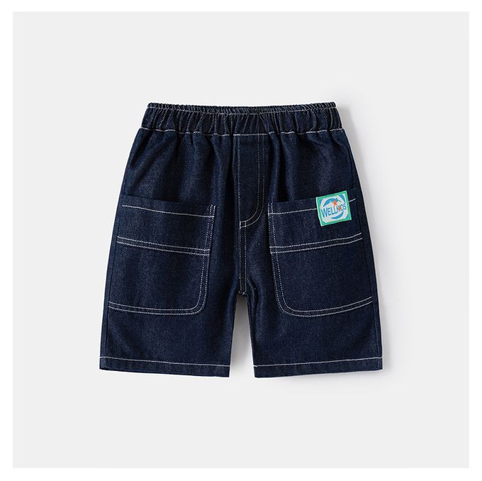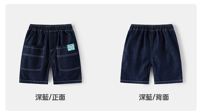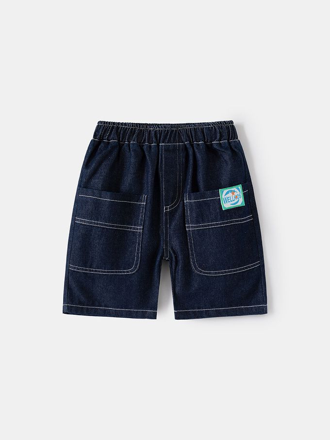 腰鬆緊休閒牛仔五分褲-造型貼標-深藍