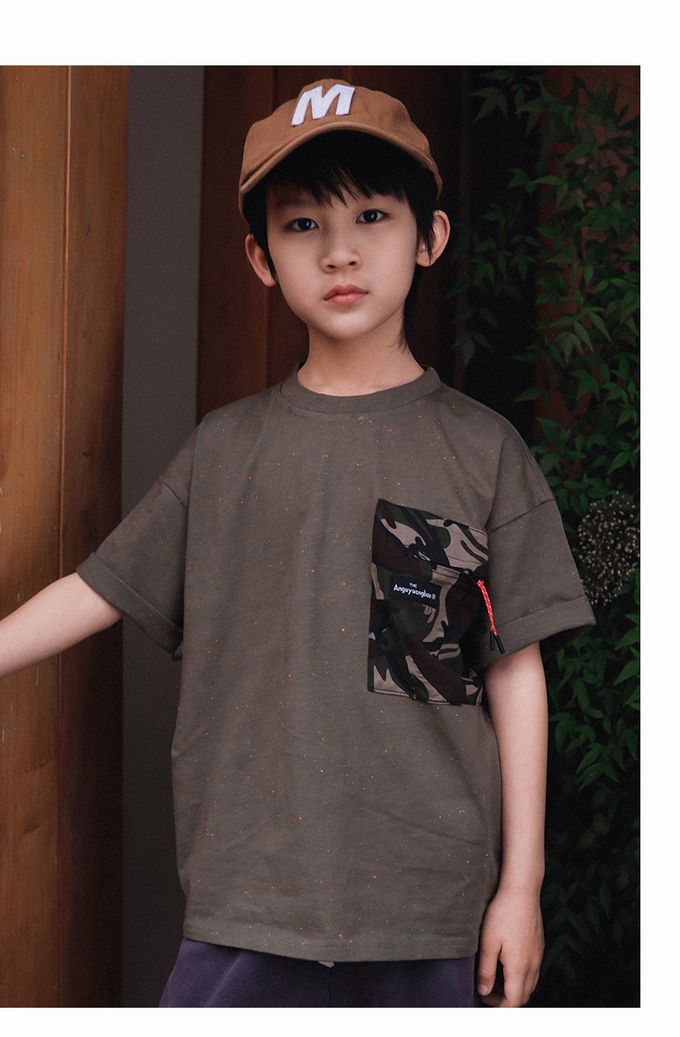 棉質圓領短袖上衣-迷彩口袋-灰綠彩點