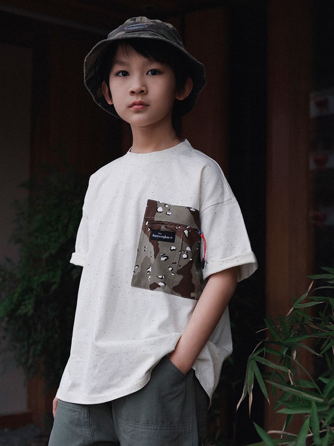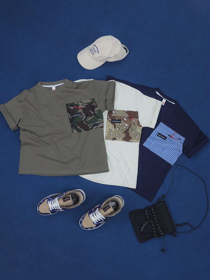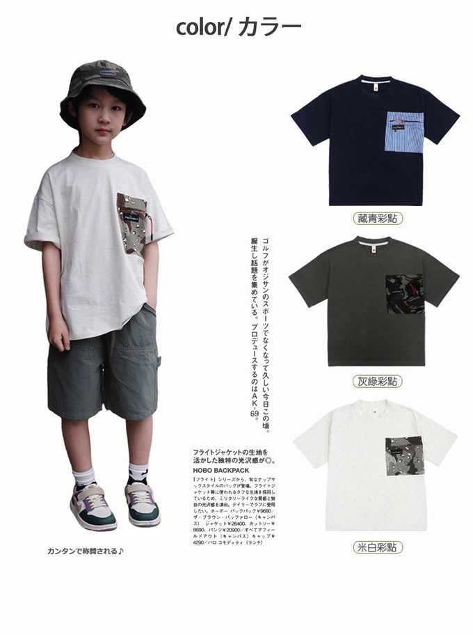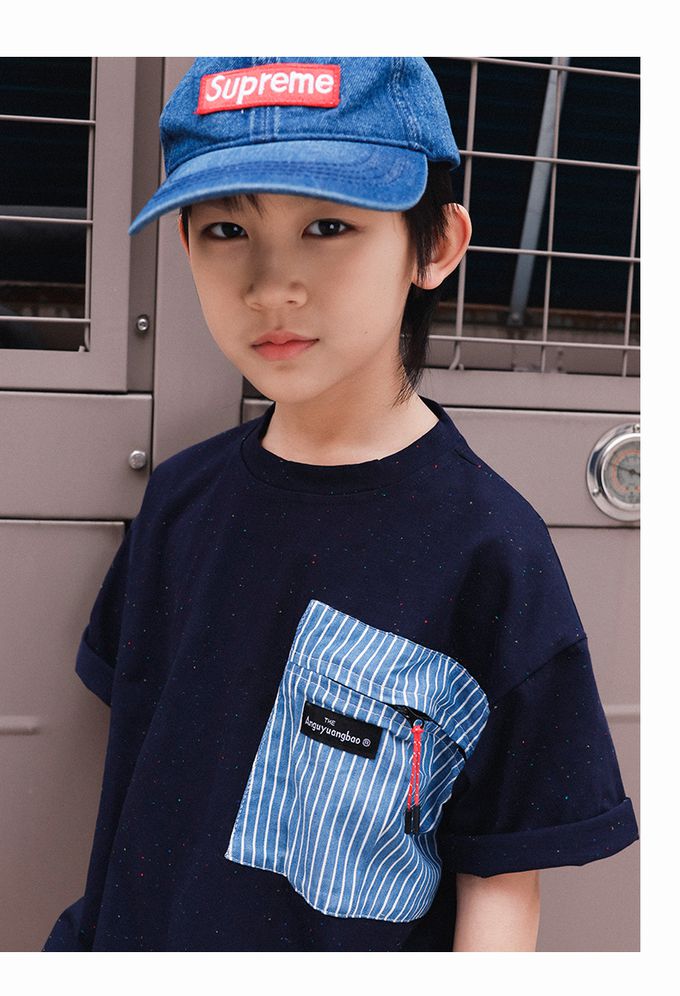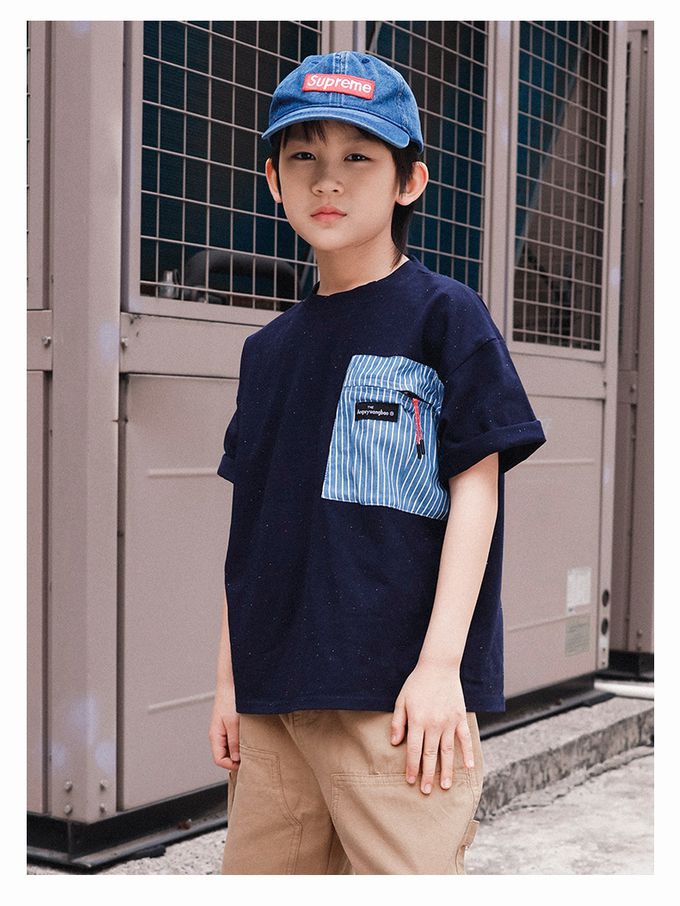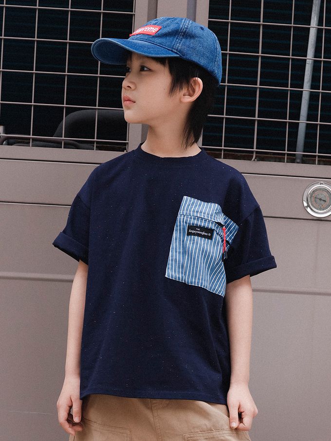 棉質圓領短袖上衣-條紋口袋-藏青彩點