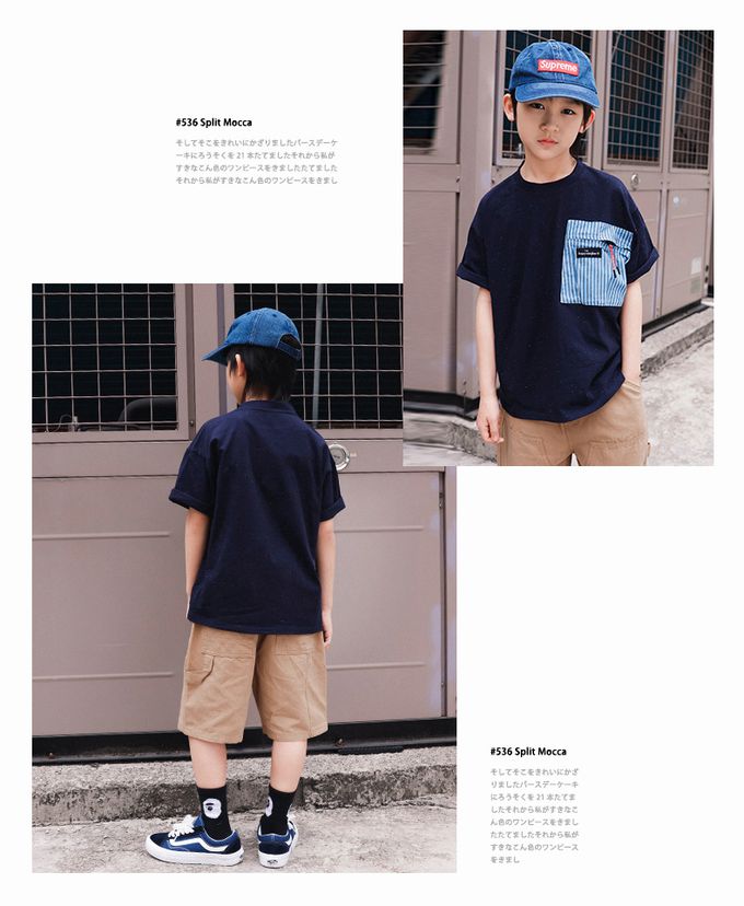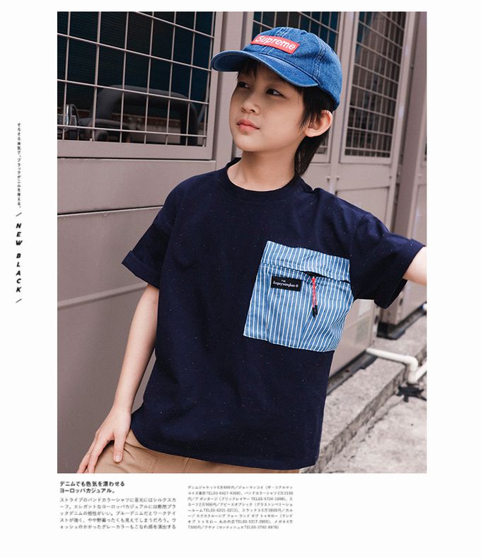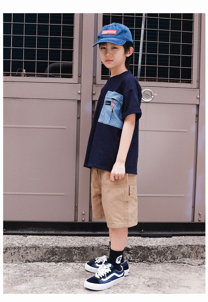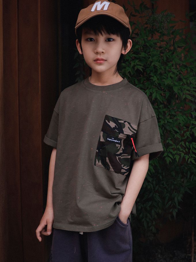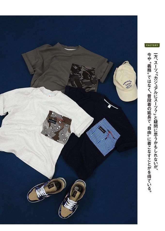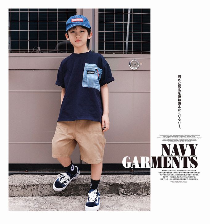 棉質圓領短袖上衣-條紋口袋-藏青彩點