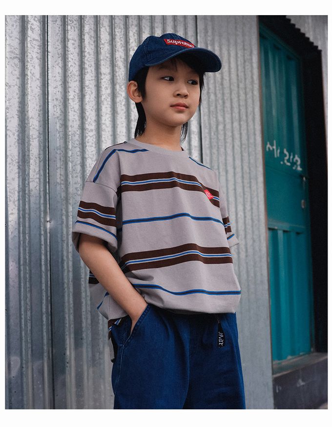 純棉圓領短袖上衣-百搭條紋-杏咖