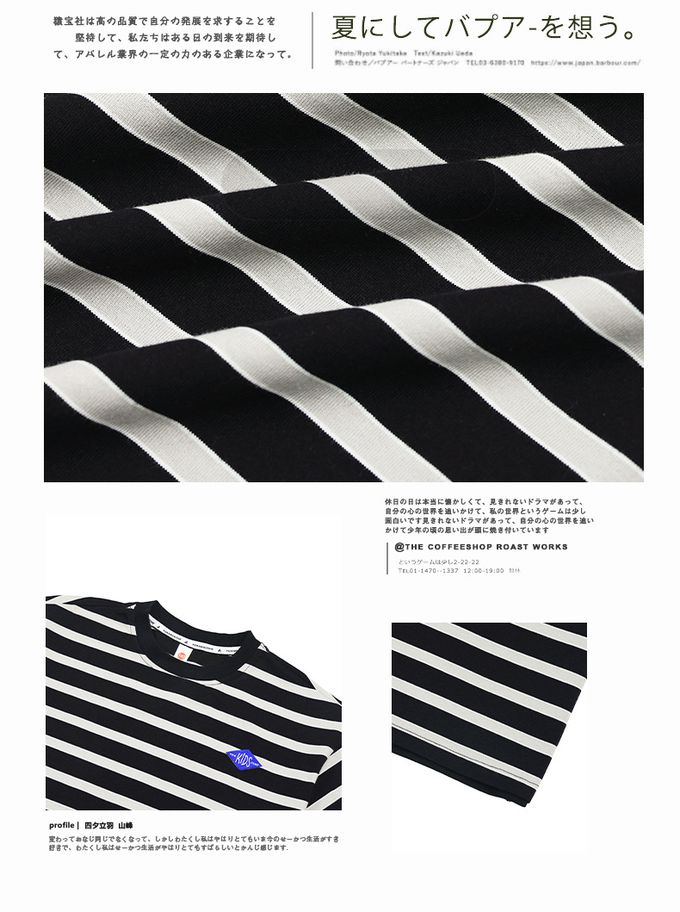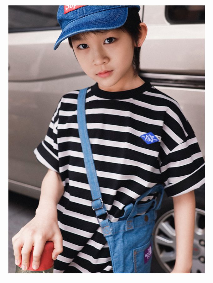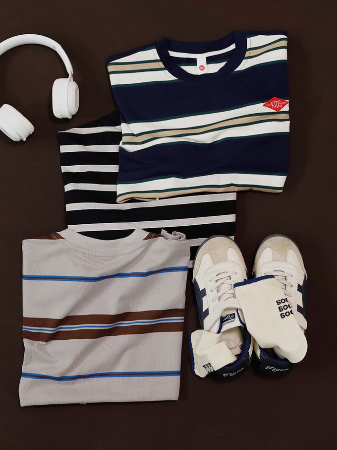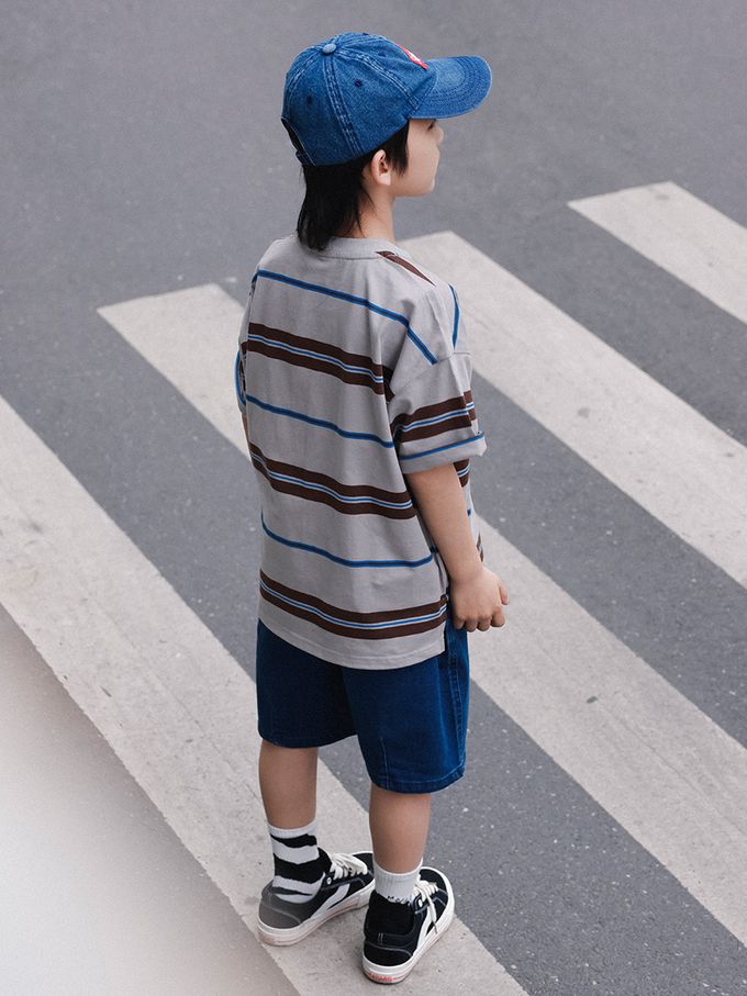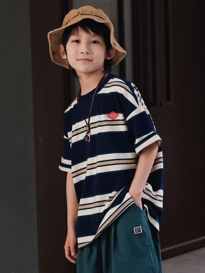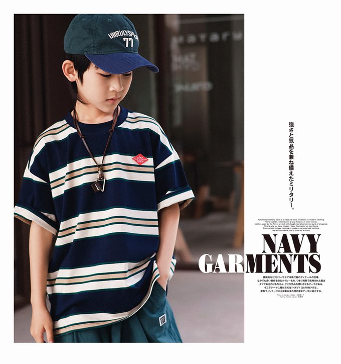 純棉圓領短袖上衣-百搭條紋-藏青