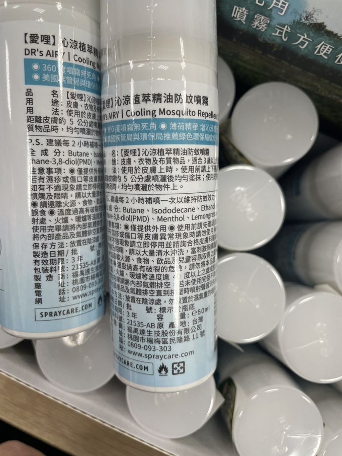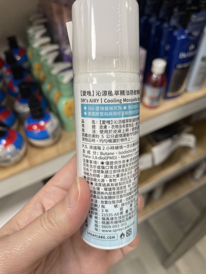 成分:Butane、Isododecane 、Ethanol、p-Men- thane-3,8-diol(PMD) ' Menthol Lemongrass oil