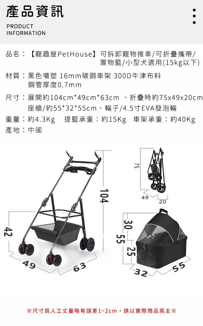 詳細尺寸:展開約104cm*49cm*63cm、折疊時約75x49x20cm