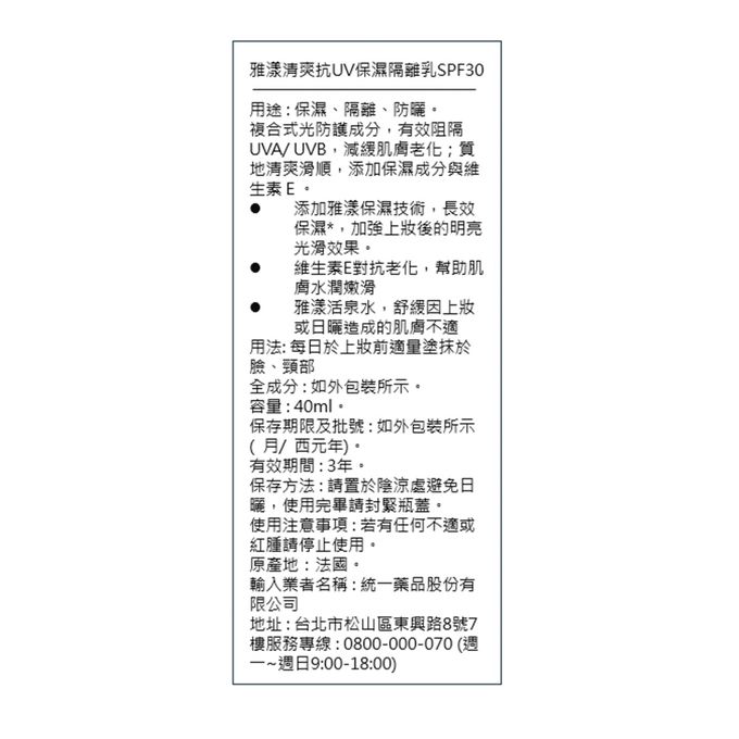 品名:Avene雅漾 清爽抗UV保濕隔離乳(40ml/條)x2條