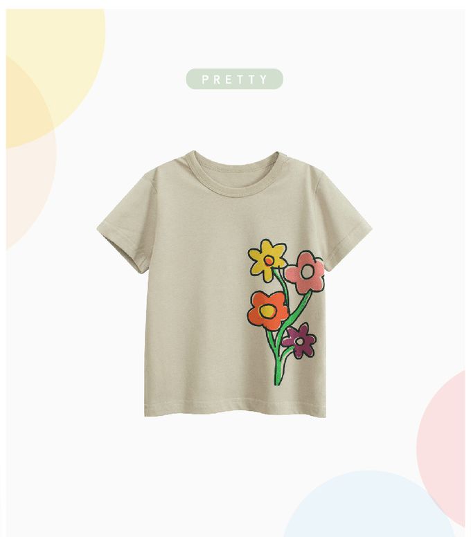 純棉短袖上衣-塗鴉花朵-淺卡其
