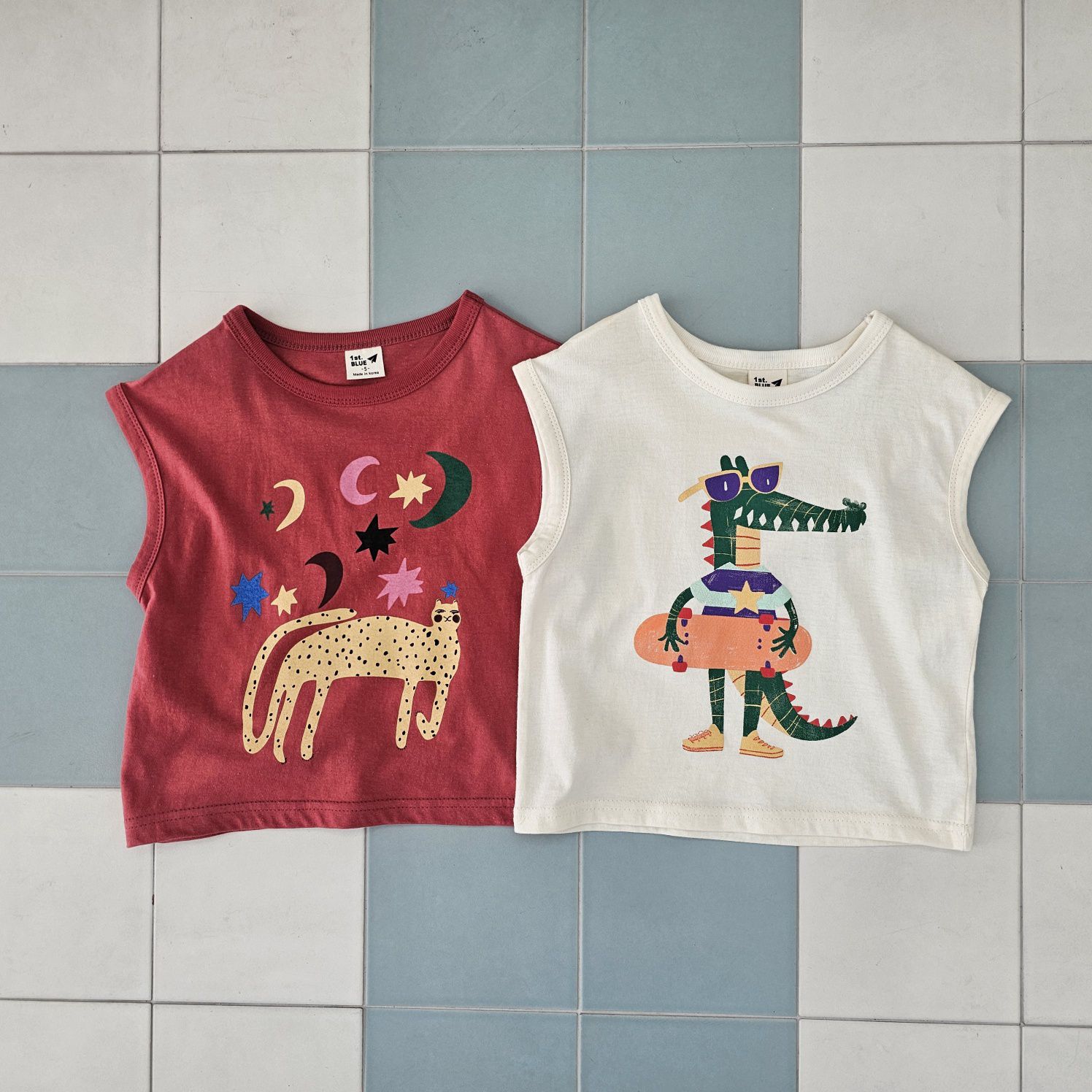 韓國 First Blue - 動物圖案插畫無袖上衣-滑板鱷魚-奶白