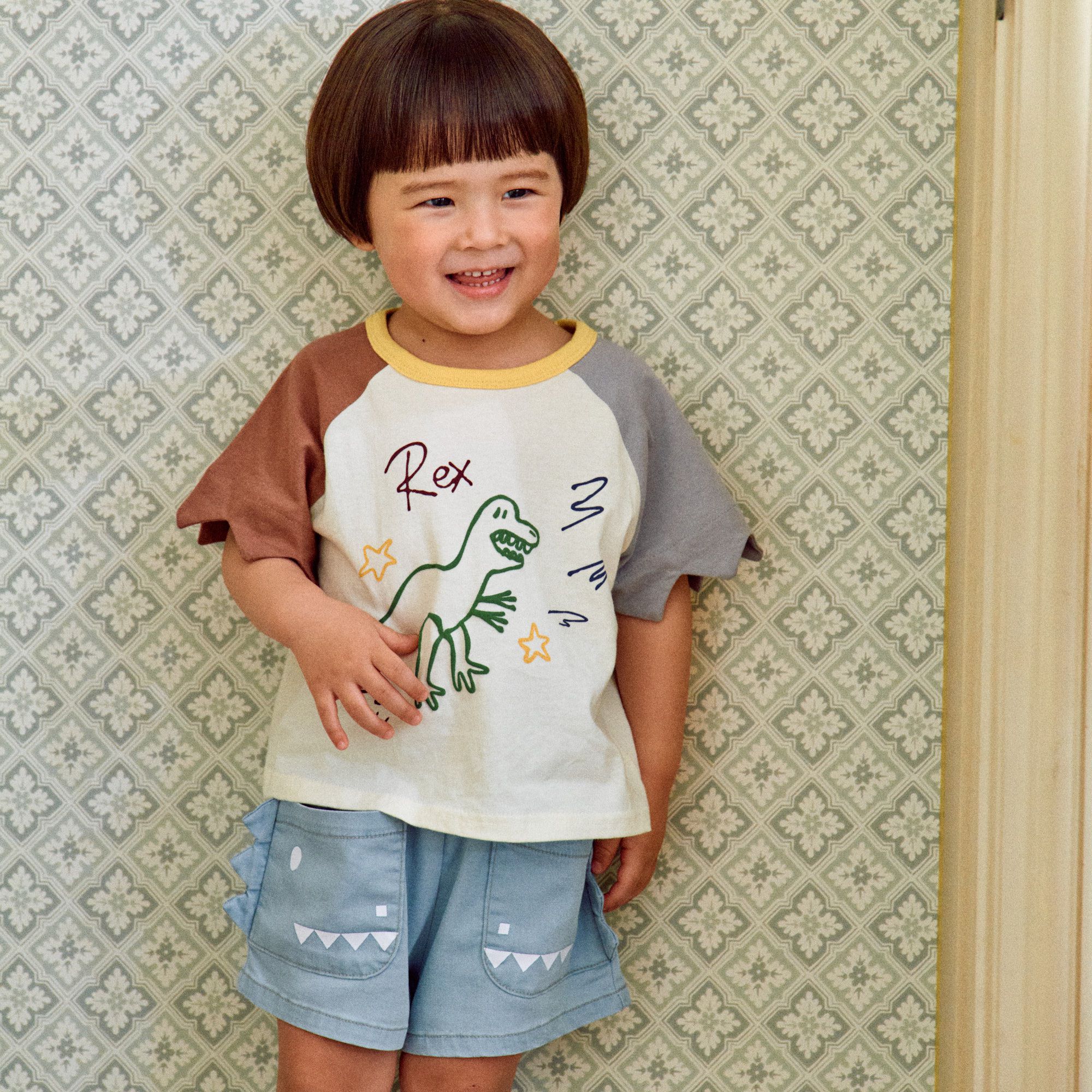• 品名:恐龍塗鴉撞色鋸齒袖上衣